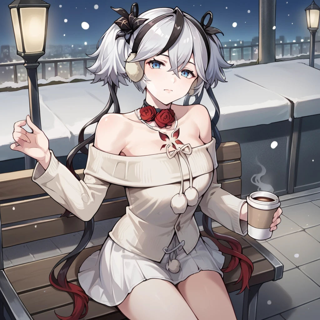 CamellyaWuwa, Fol001, Cml_Wnt, white hair, grey eyes, twintails, streaked hair, black streaks, twisted hair, light brown sweater, off-shoulder sweater, light brown sleeves, necklace, black hairband, long sleeves, light brown skirt, pom pom (clothes), bare shoulders, flower choker, black choker, red rose, black flower, hair flower, earmuffs, light brown ribbon, bow ribbon, light brown boots, knee boots,Shopper Outfit: