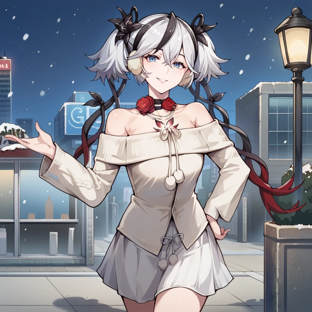 Cml_Wnt, earmuffs, white sweater, off-shoulder sweater, long sleeves, white sleeves, bare shoulders, flower choker, black choker, red flower, white skirt, miniskirt, necklace, black flower,Pajamas Outfit: (Spa Collab Outfit) (Remove "long hair, twisted hair, twintails,")
