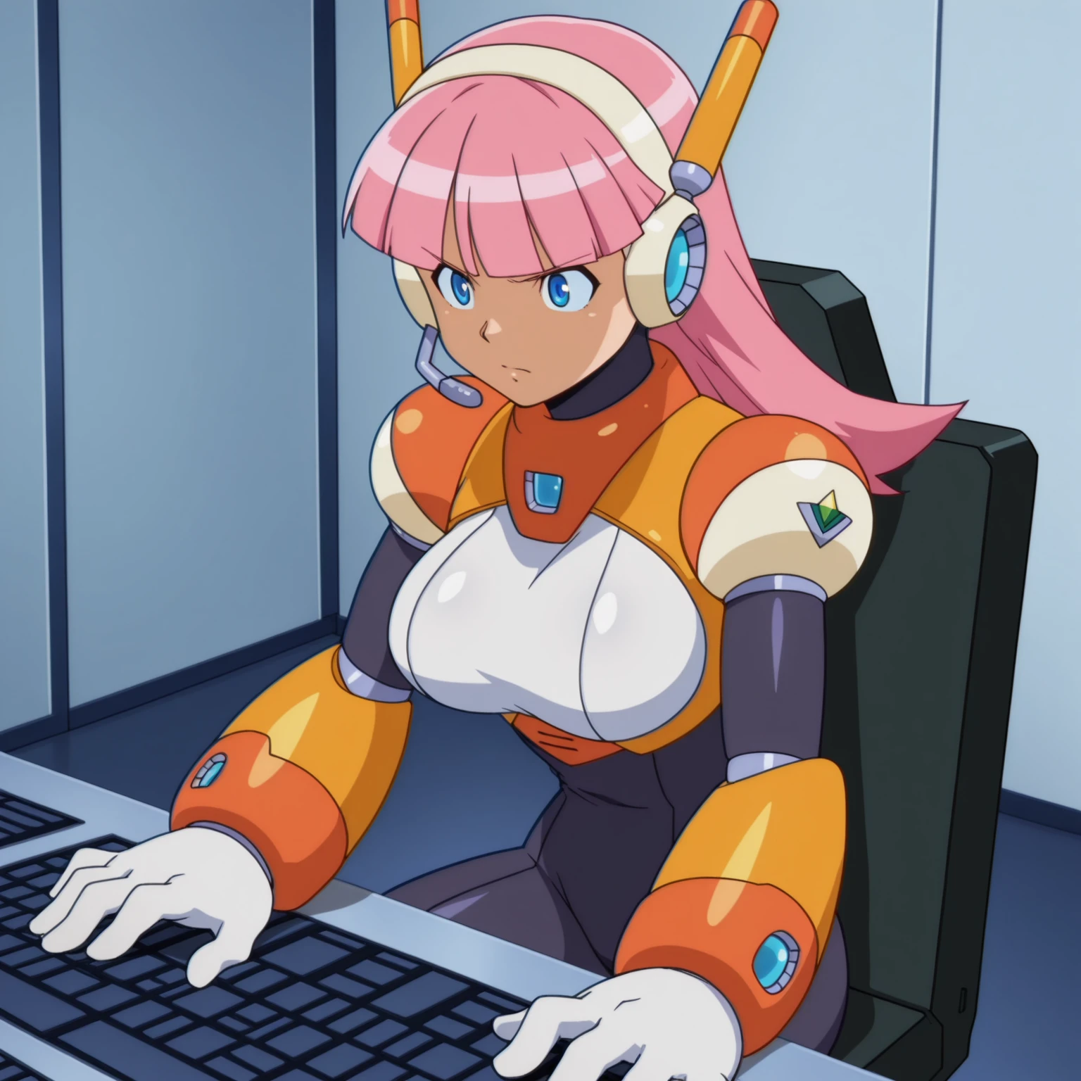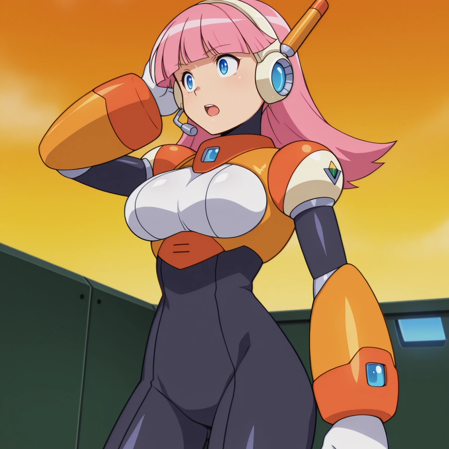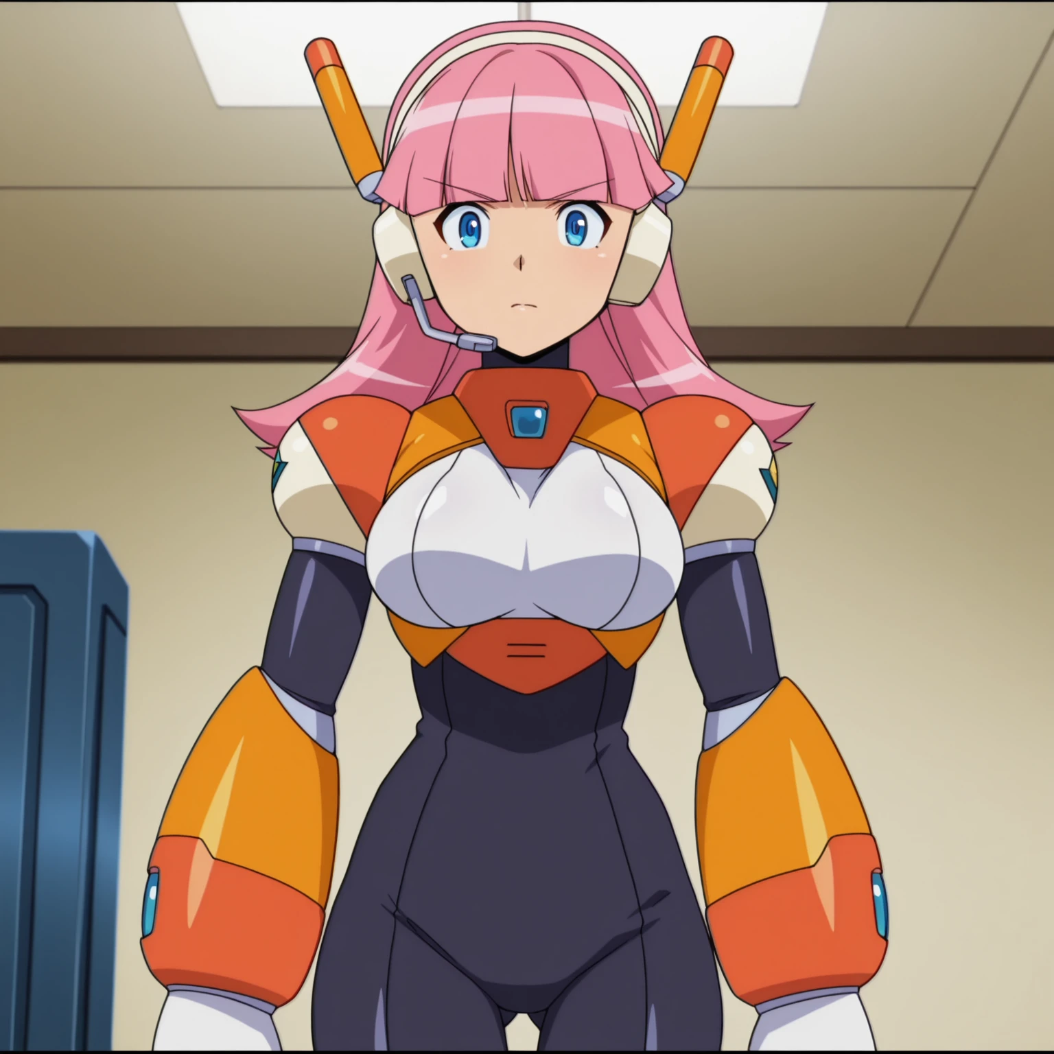 pink hair, long hair, blunt bangs, blue eyes, large breasts, headset, android, bodysuit,