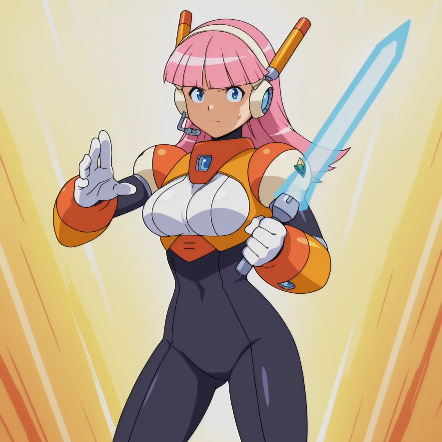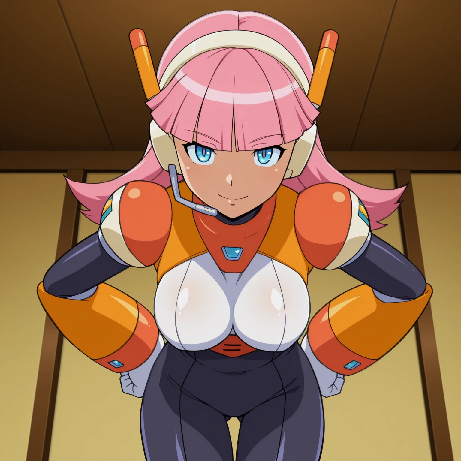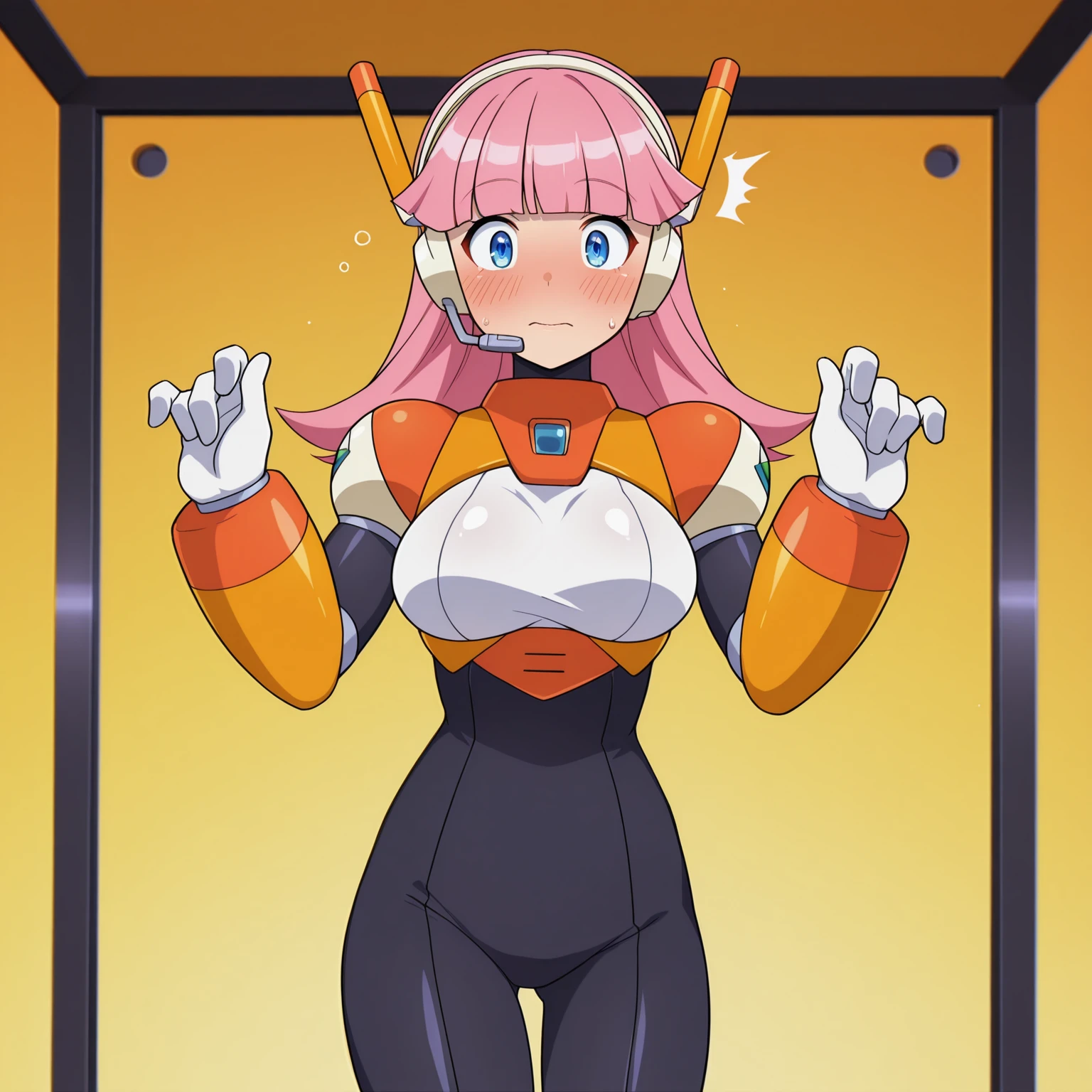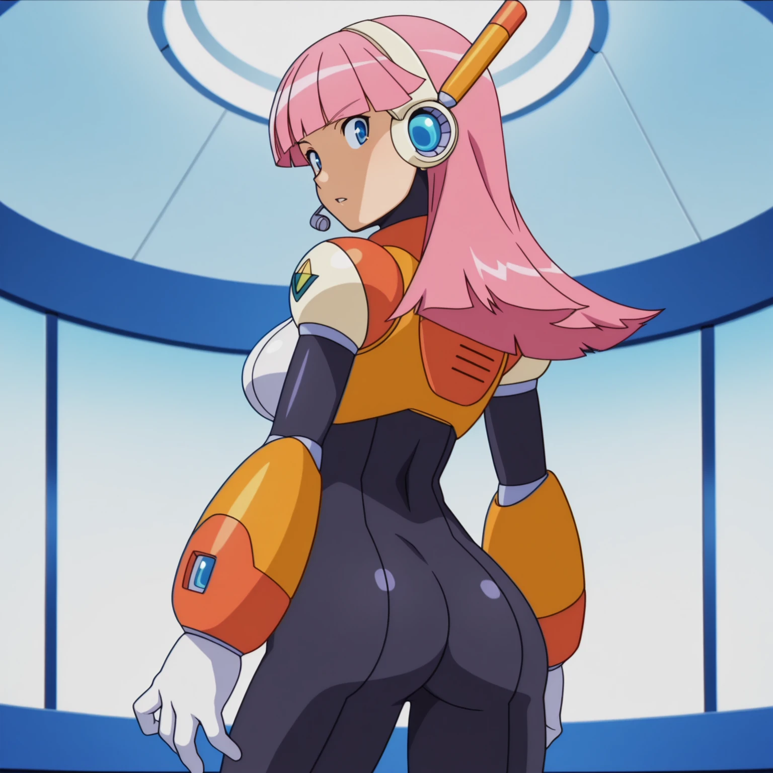 pink hair, long hair, blunt bangs, blue eyes, large breasts, headset, android, bodysuit,