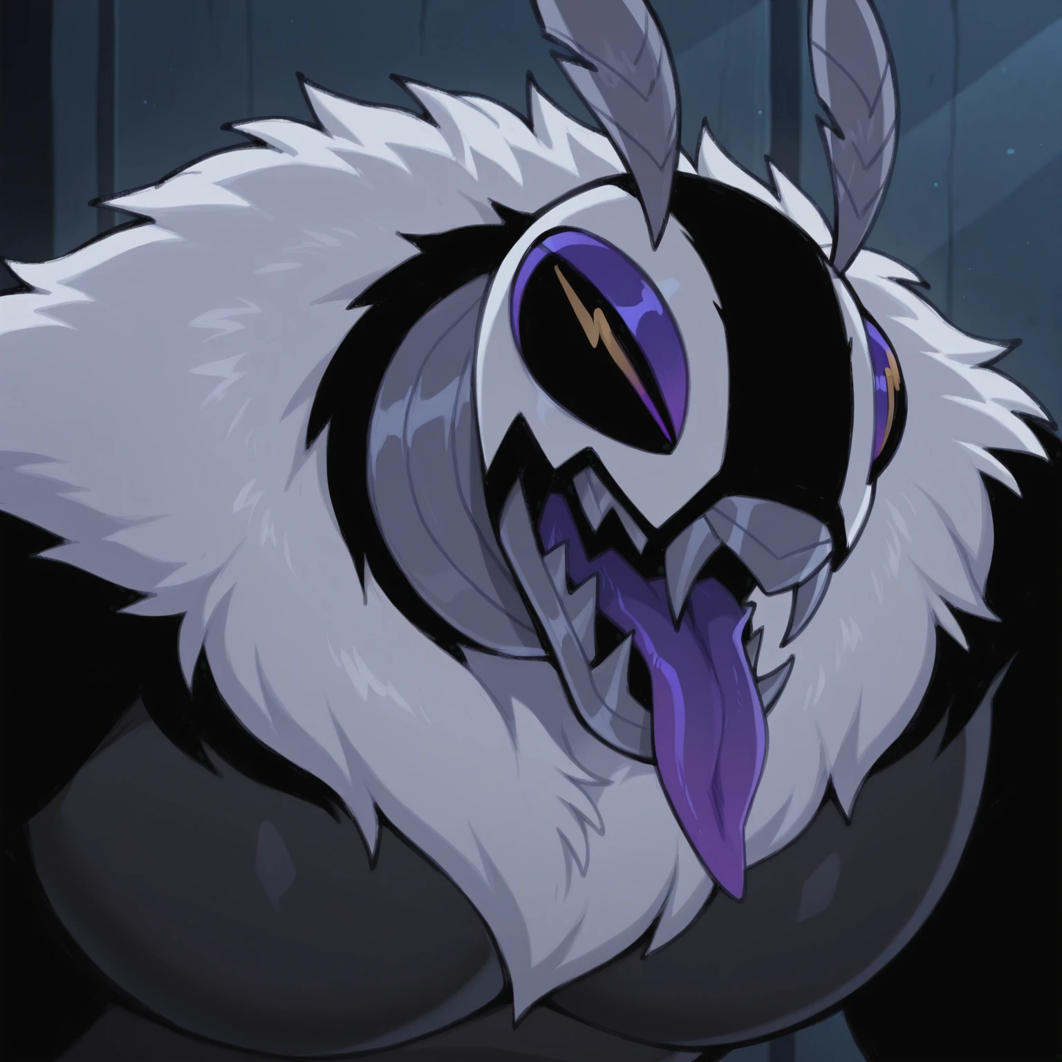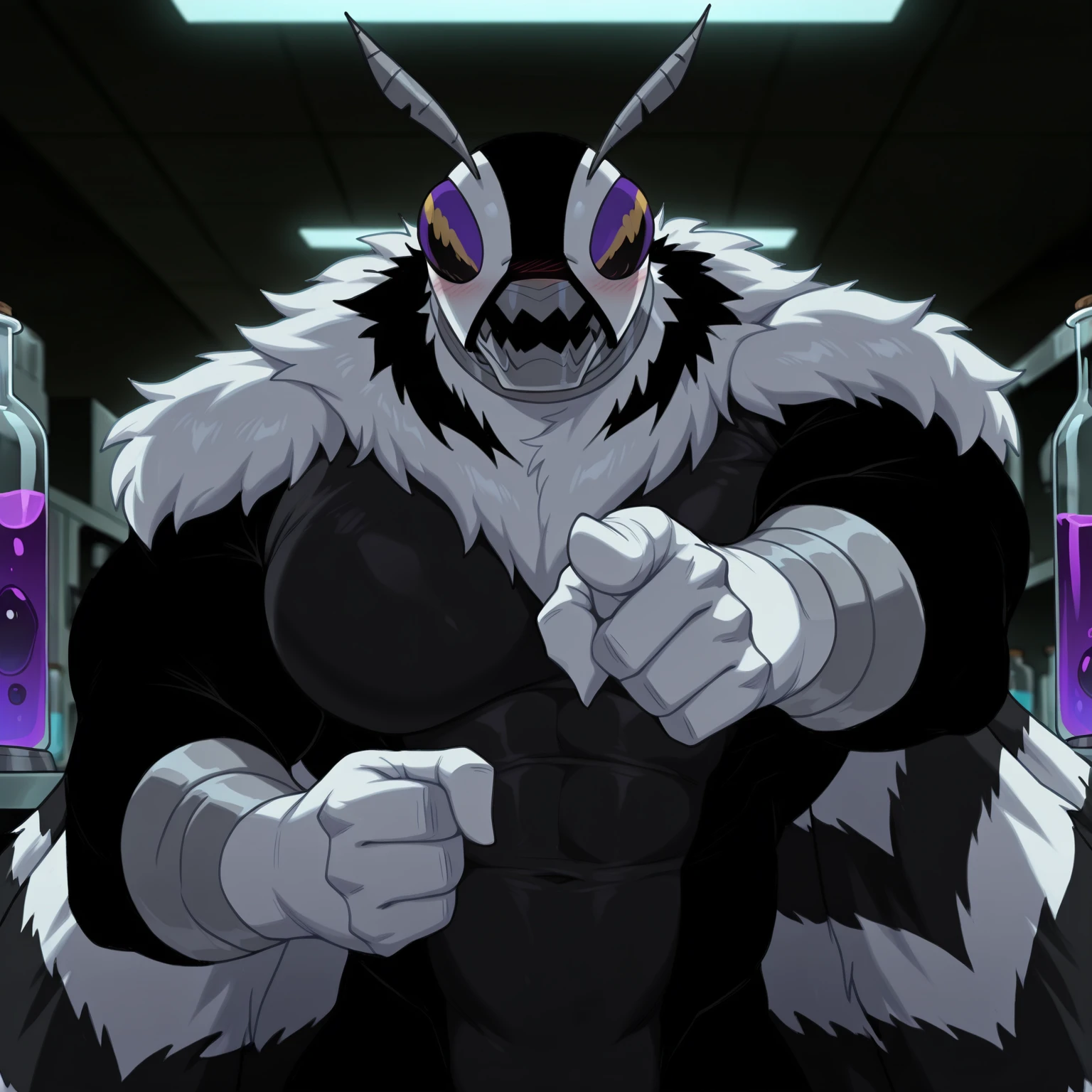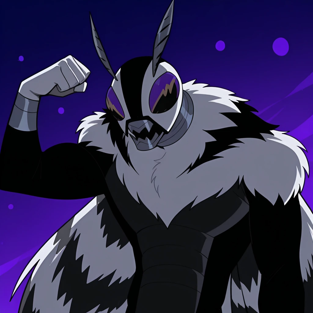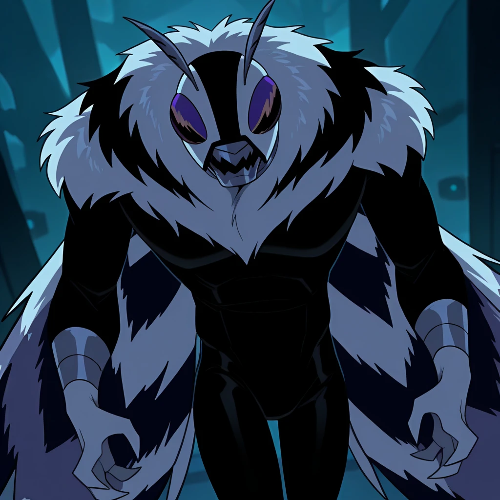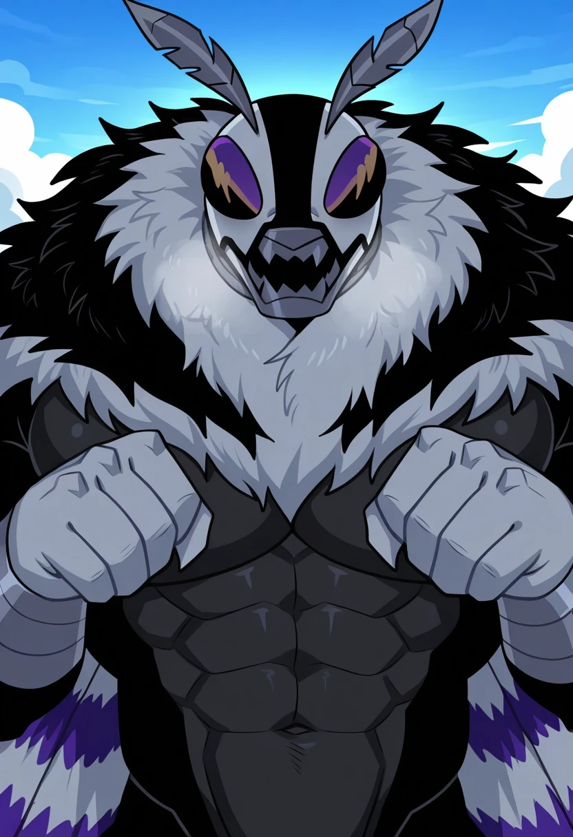 Tags: moth, monster, insect humanoid, fur collar, mandible, multicolored fur, antennae, wings (optional), purple compound eyes, two-toned skin, grey skin