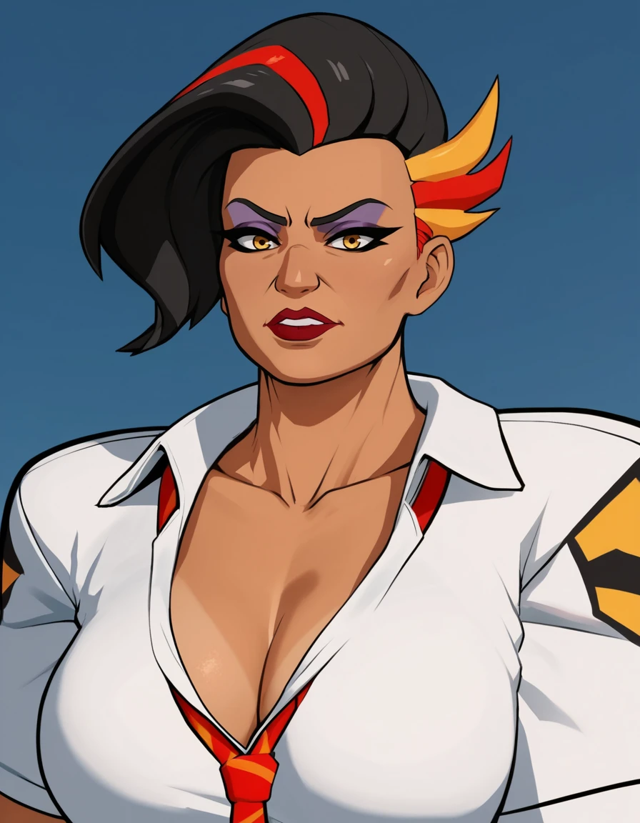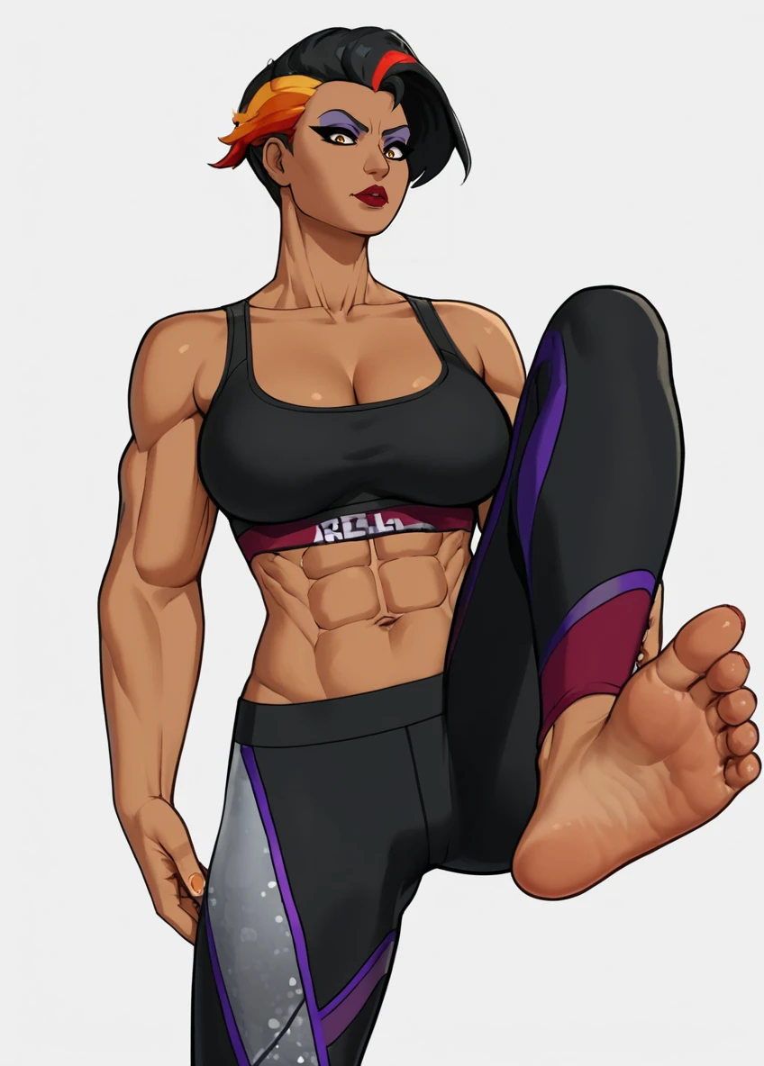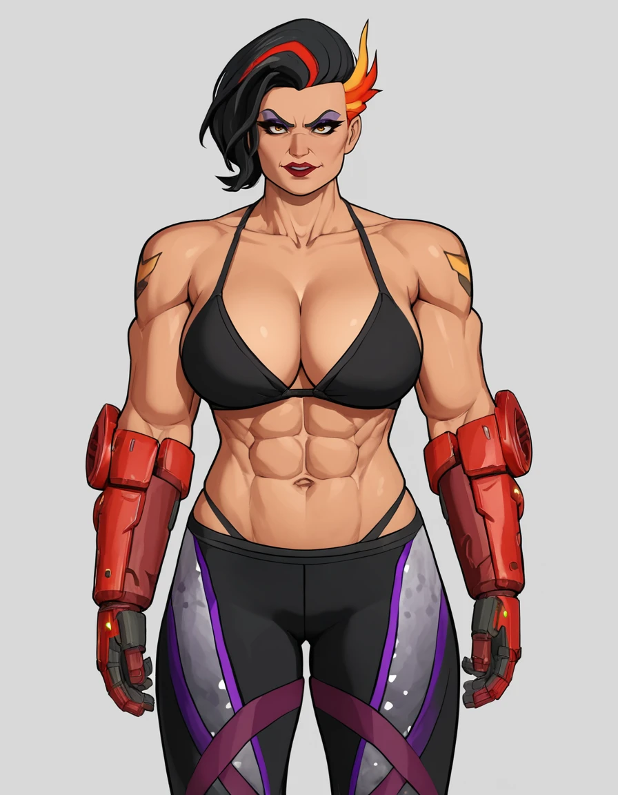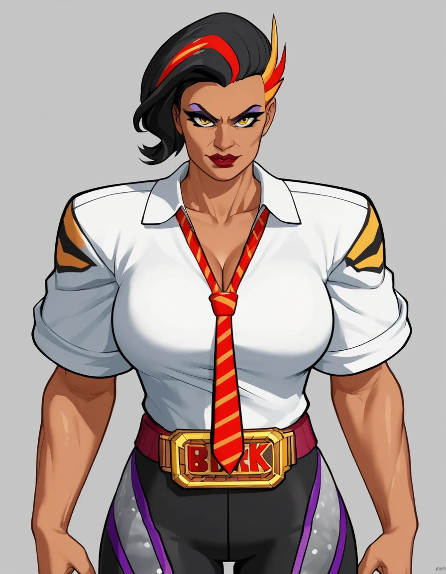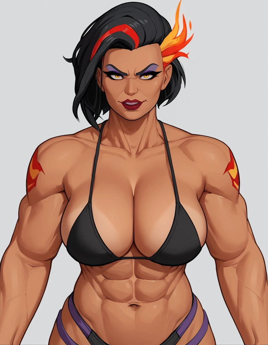 black hair, with red and yellow bold streaks of fiery red and golden yellow, muscular female, Purple eyeshadow, reddish lipstick,
