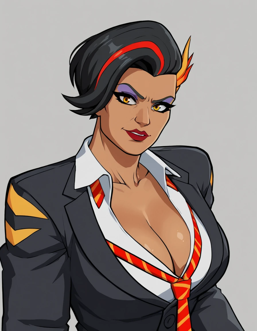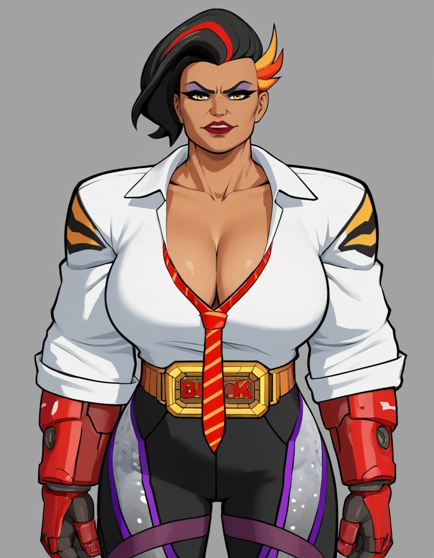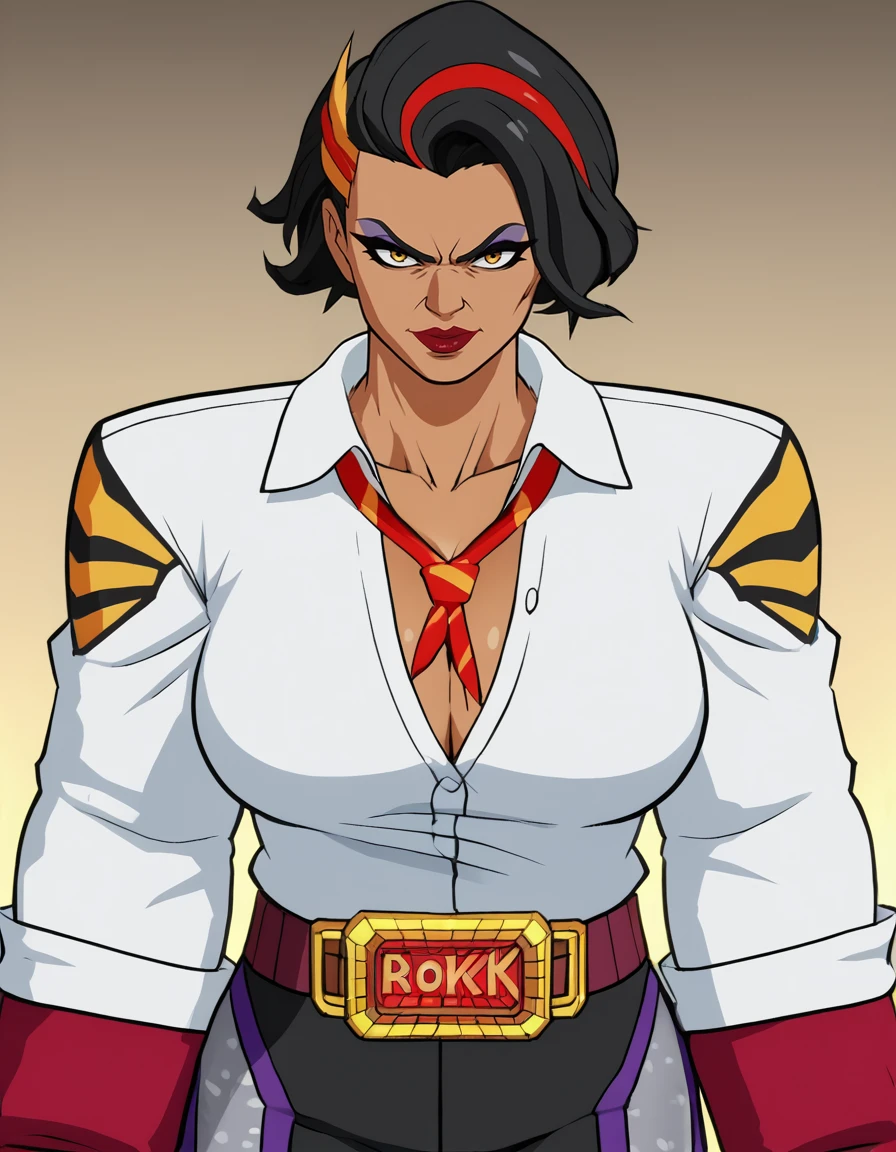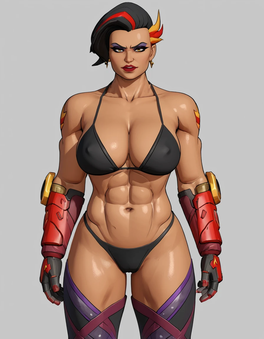 black hair, with red and yellow bold streaks of fiery red and golden yellow, muscular female, Purple eyeshadow, reddish lipstick,
