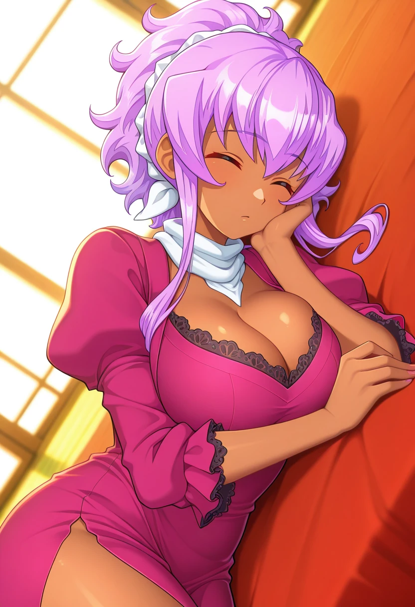 EfaGranada, 1girl, solo, mature female, dark-skinned female, closed eyes, ponytail, purple hair, hair ribbon, white hair ribbon