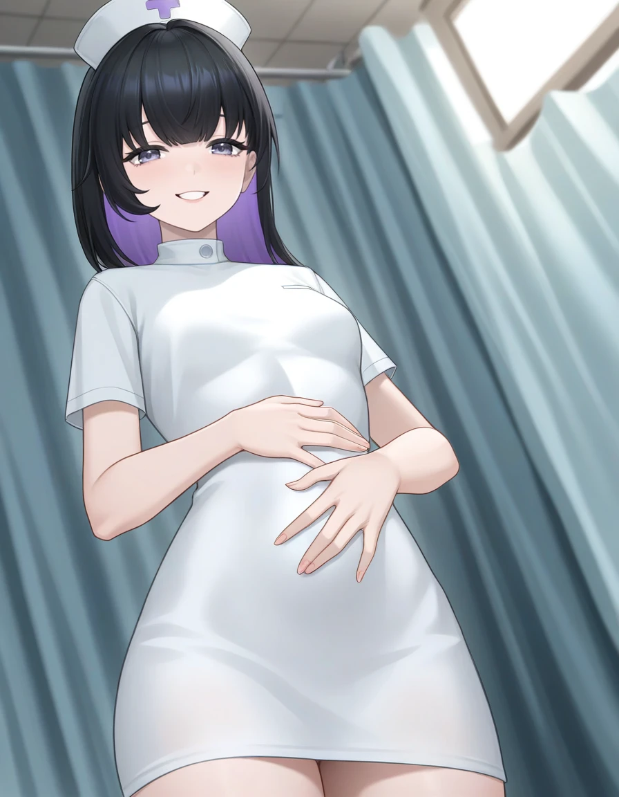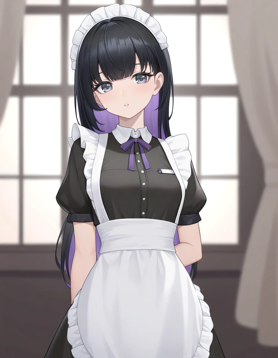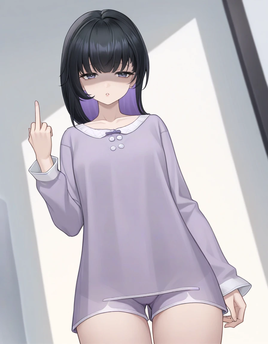 pi snowbreak,1girl,solo,black hair,multicolored hair,colored inner hair,bangs,purple hair,breasts,asymmetrical clothes,pleated skirt,thighhighs,elbow gloves,hair ornament,single thighhigh,skirt,gloves,Description