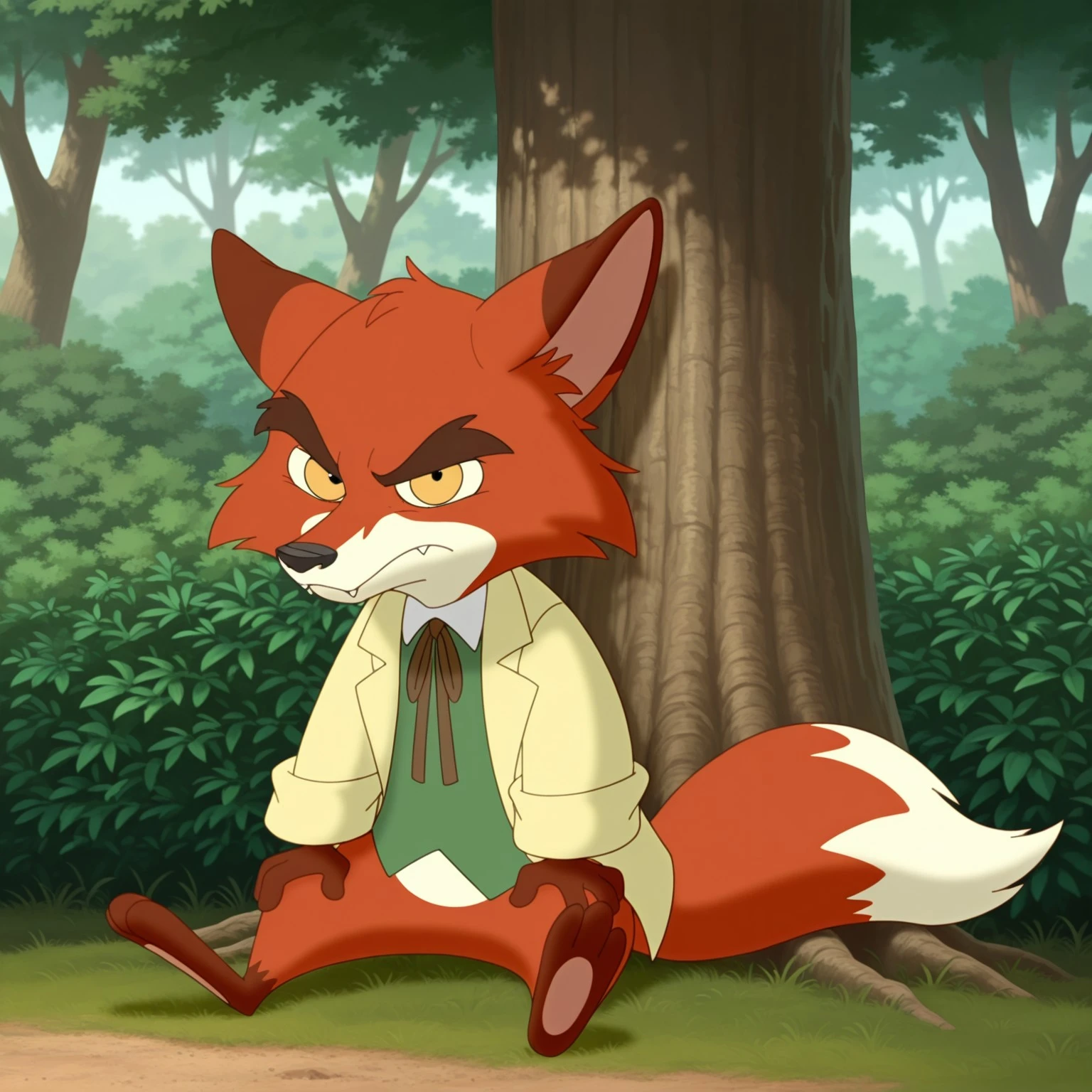 Tags: furry male, fox boy, fox ears, fox tail, brown eyebrows, orange fur, black nose, fangs, white fur, multicolored fur, yellow sclera, light yellow coat, long sleeves, shirt collar, Brown neck ribbon, green vest,