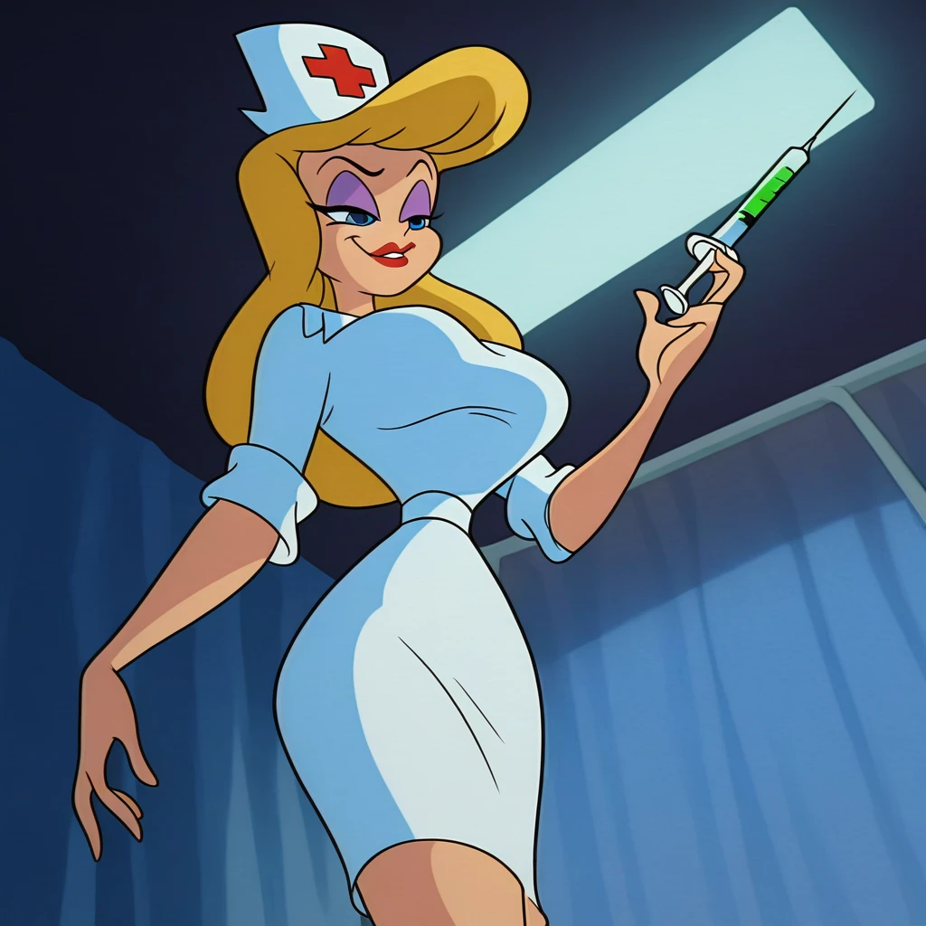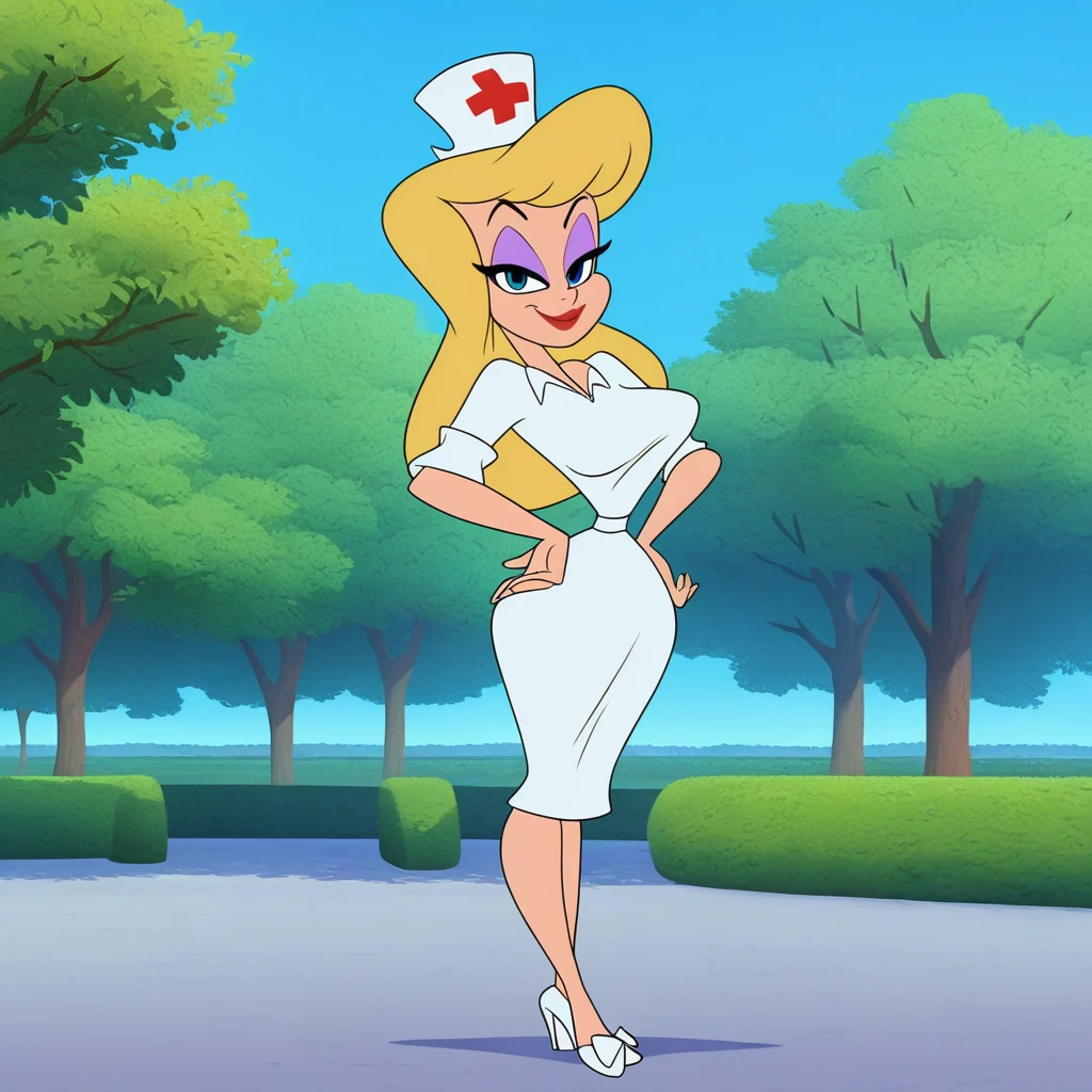 Default: Nurse, 1girl,, long hair, breasts, blue eyes, blonde hair, large breasts, hat, dress, high heels, makeup, lipstick, eyeshadow, nurse cap, nurse, style parody, flat color, red cross