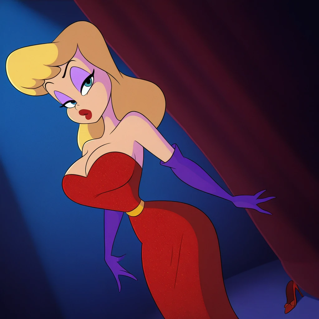Jessica Rabbit cosplay: Nurse, 1girl, long hair, breasts, blue eyes, blonde hair, large breasts, dress, cleavage, bare shoulders, medium breasts, shoes, elbow gloves, high heels, hand on hip, strapless, makeup, red dress, lipstick, strapless dress, side slit, eyeshadow, single glove, hands on hips, red lips, eyeliner, asymmetrical gloves, purple eyeshadow