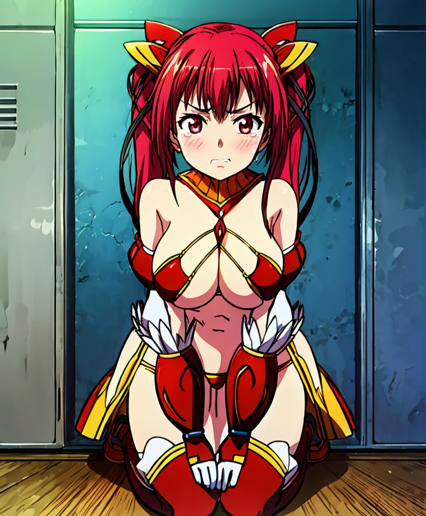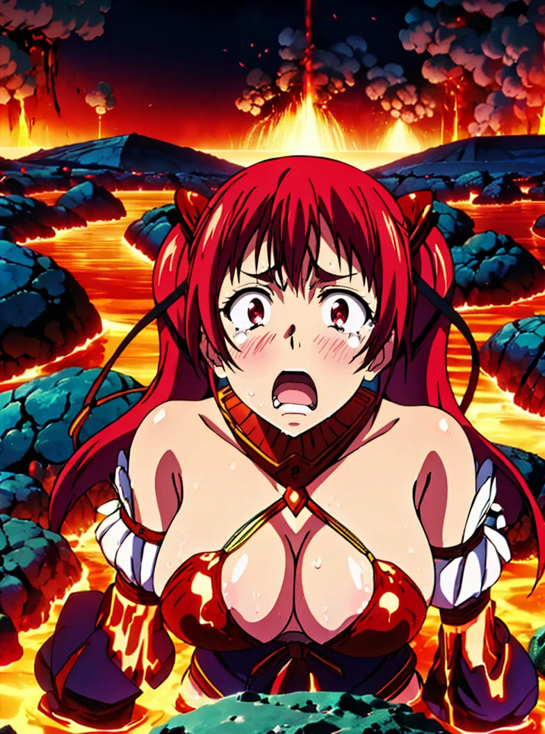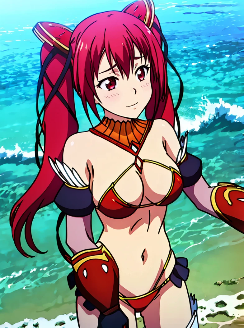 m45ht4l_3, blush, open mouth, large breasts, hair ornament, red eyes, gloves, ribbon, bare shoulders, twintails, very long hair, swimsuit, hair ribbon, red hair, detached sleeves, detached collar, gauntlets, vambraces, bikini armor,