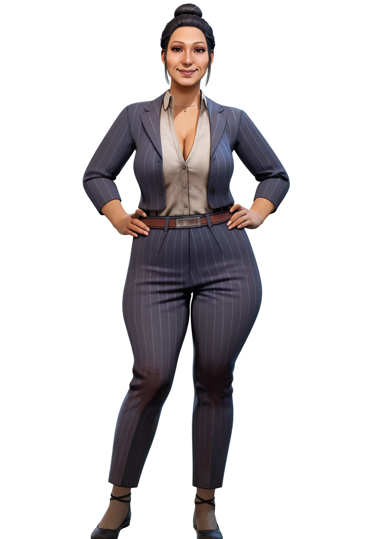 pinstripe suit, necklace, jacket, shirt, cleavage, belt, pants, black shoes, formal