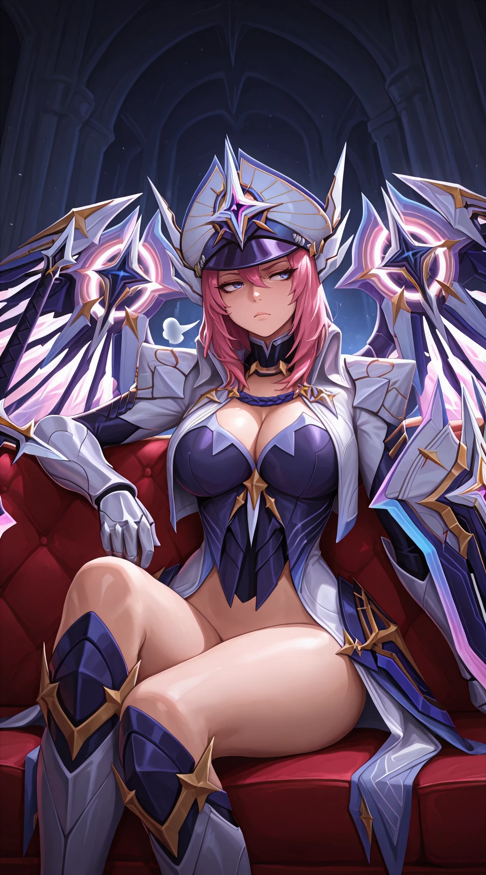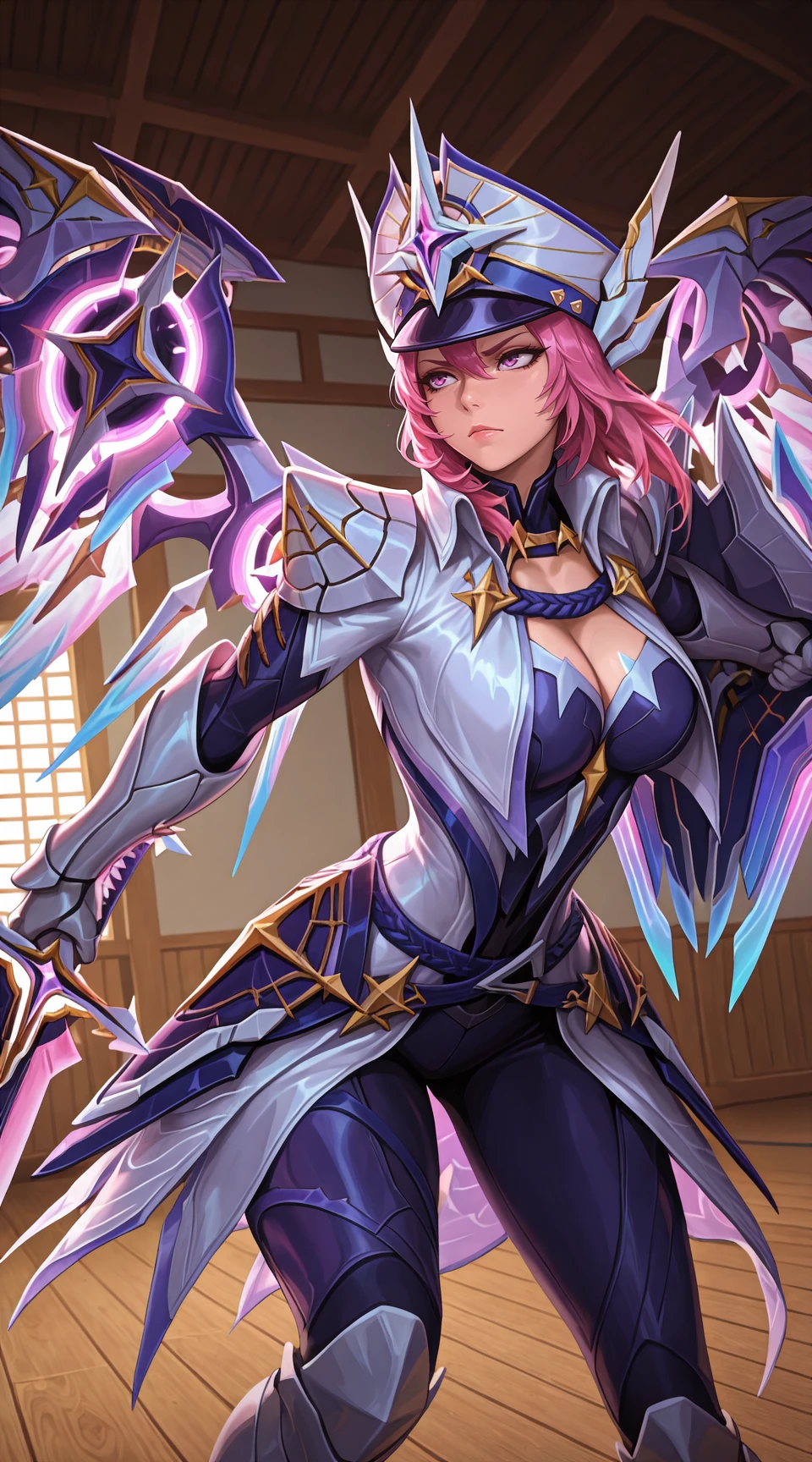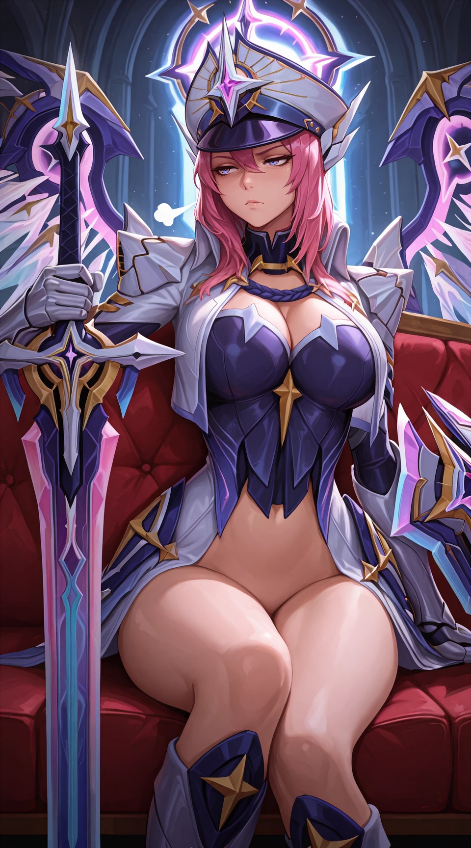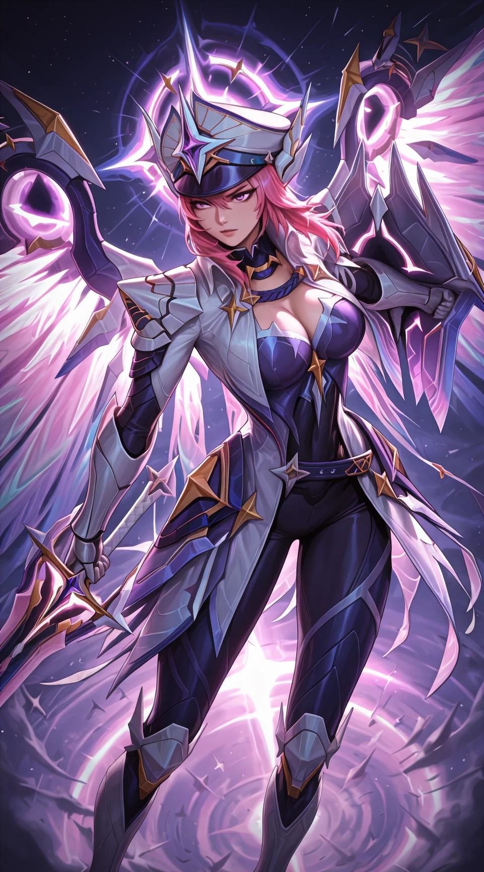 Example Prompt: freya_mlbb, armor, sword, galatic_vanquisher, peaked_cap, gauntlets, shield, boots, triangle_belt, wings, purple_eyes