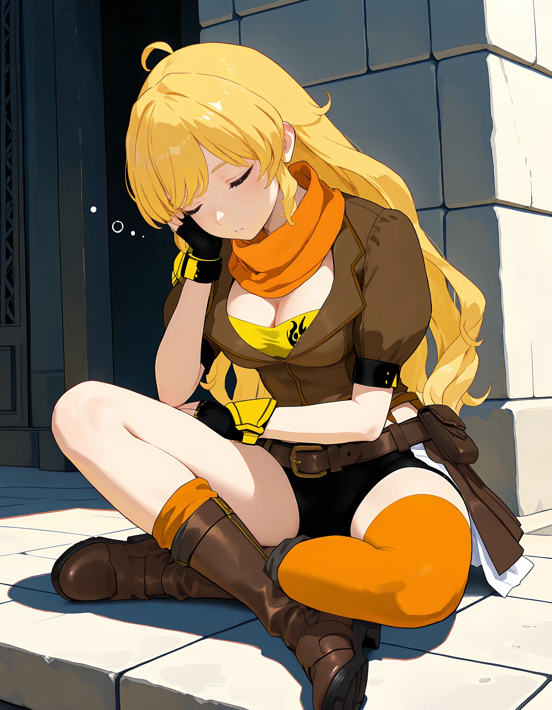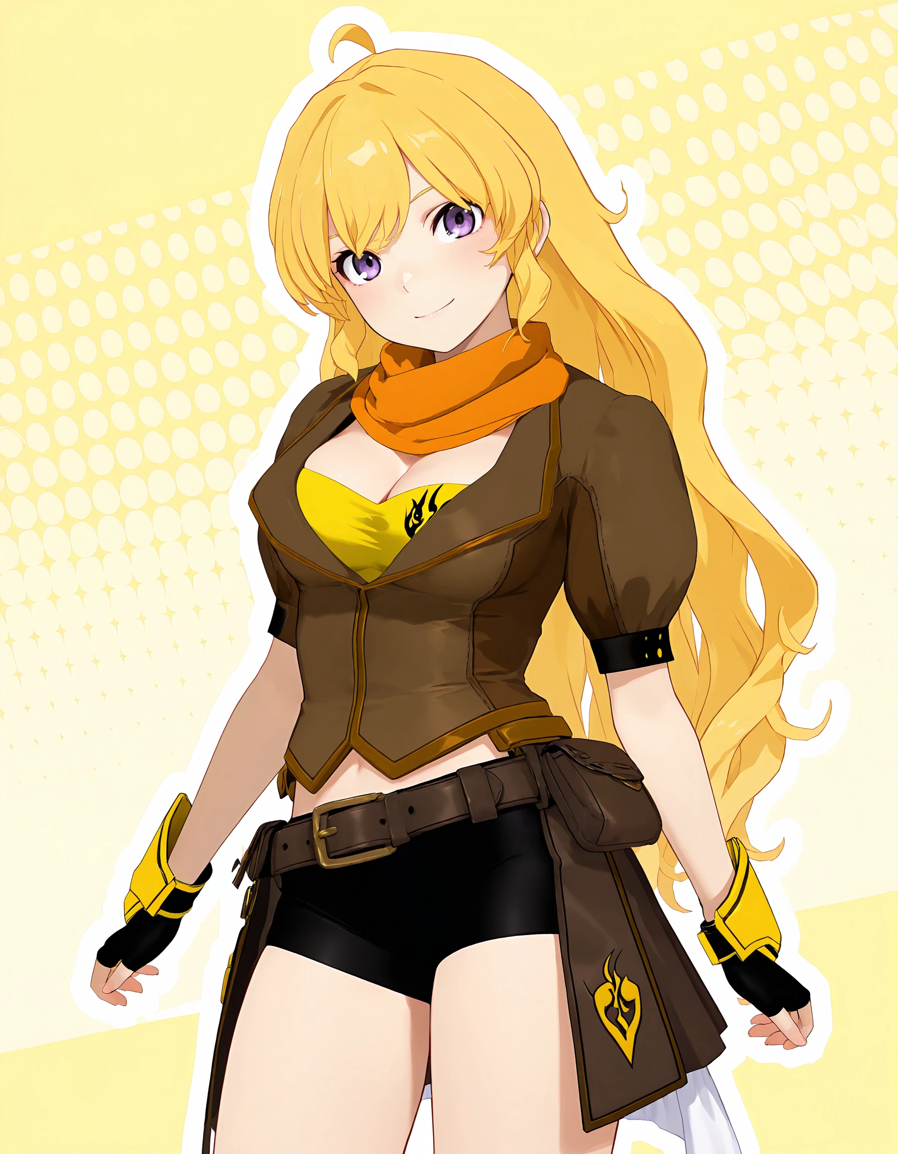 YangXiaoLongV1, blonde hair, purple eyes, long hair, ahoge, wavy hair, orange scarf, brown jacket, cropped jacket, cleavage, puffy short sleeves, gauntlets, fingerless gloves, black shorts, hip cape, belt, orange legwear, uneven legwear, knee boots, brown boots,
