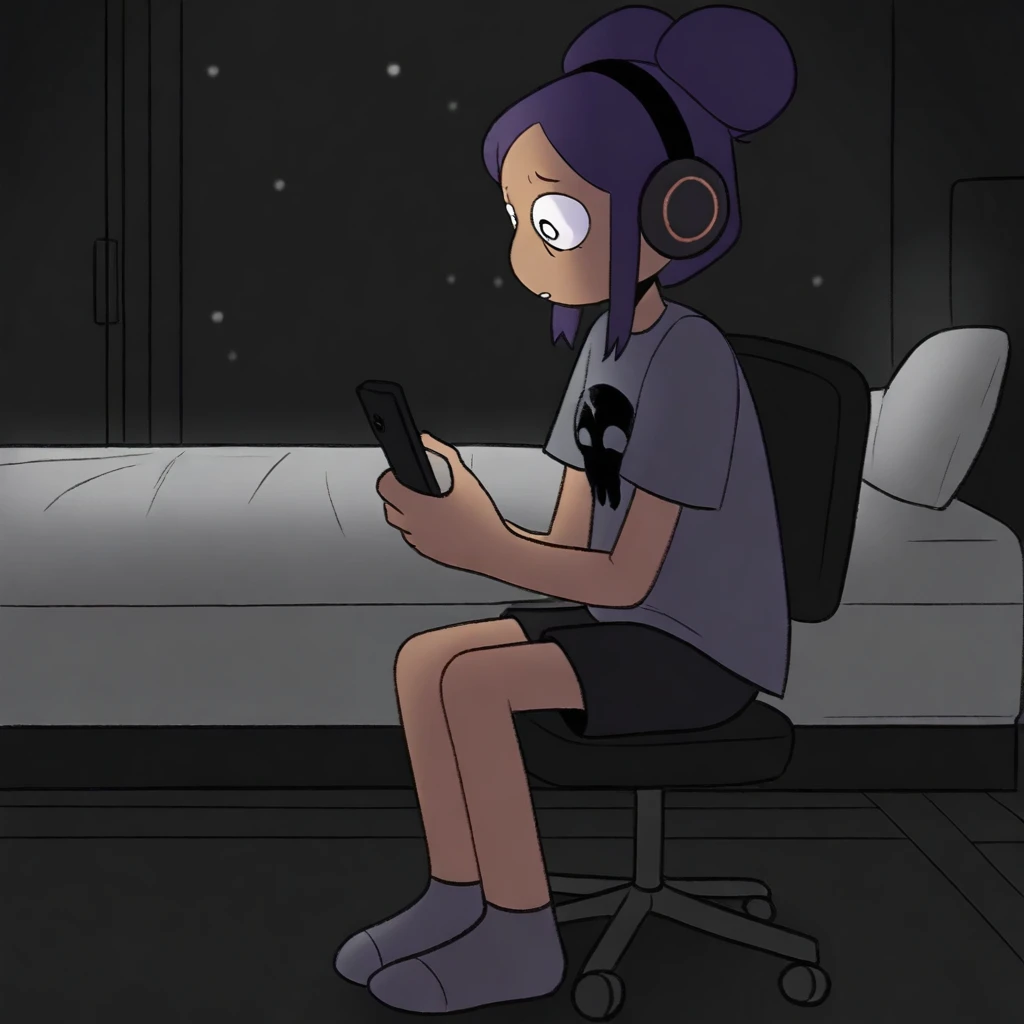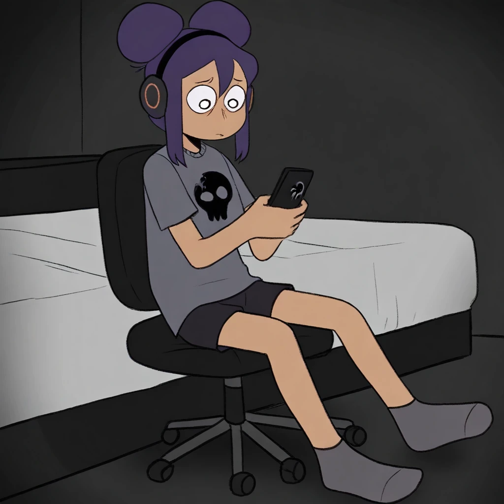 amazing quality, best quality, newest, 1girl, solo, purple hair. double buns, wide eyes, gray oversized t-shirt with black skull print, black shorts, grey socks, full body, light brown skin,