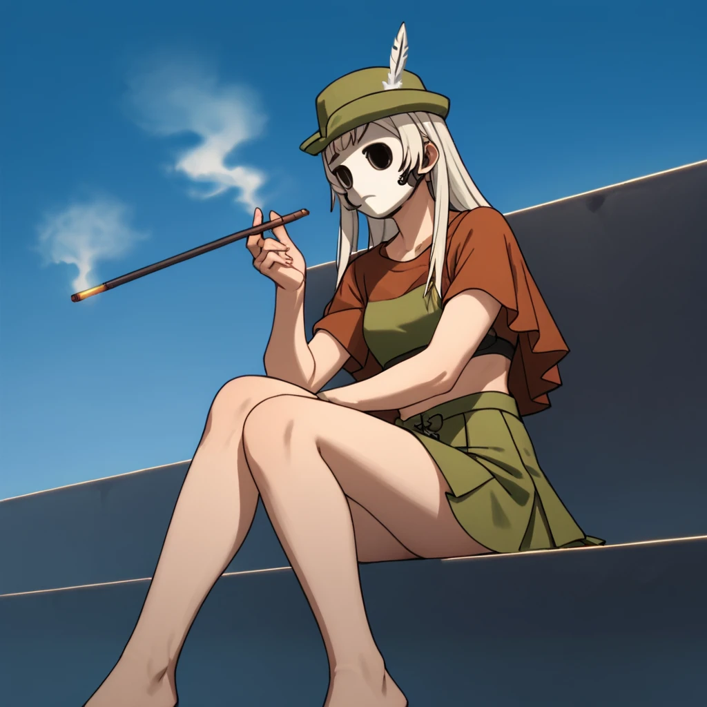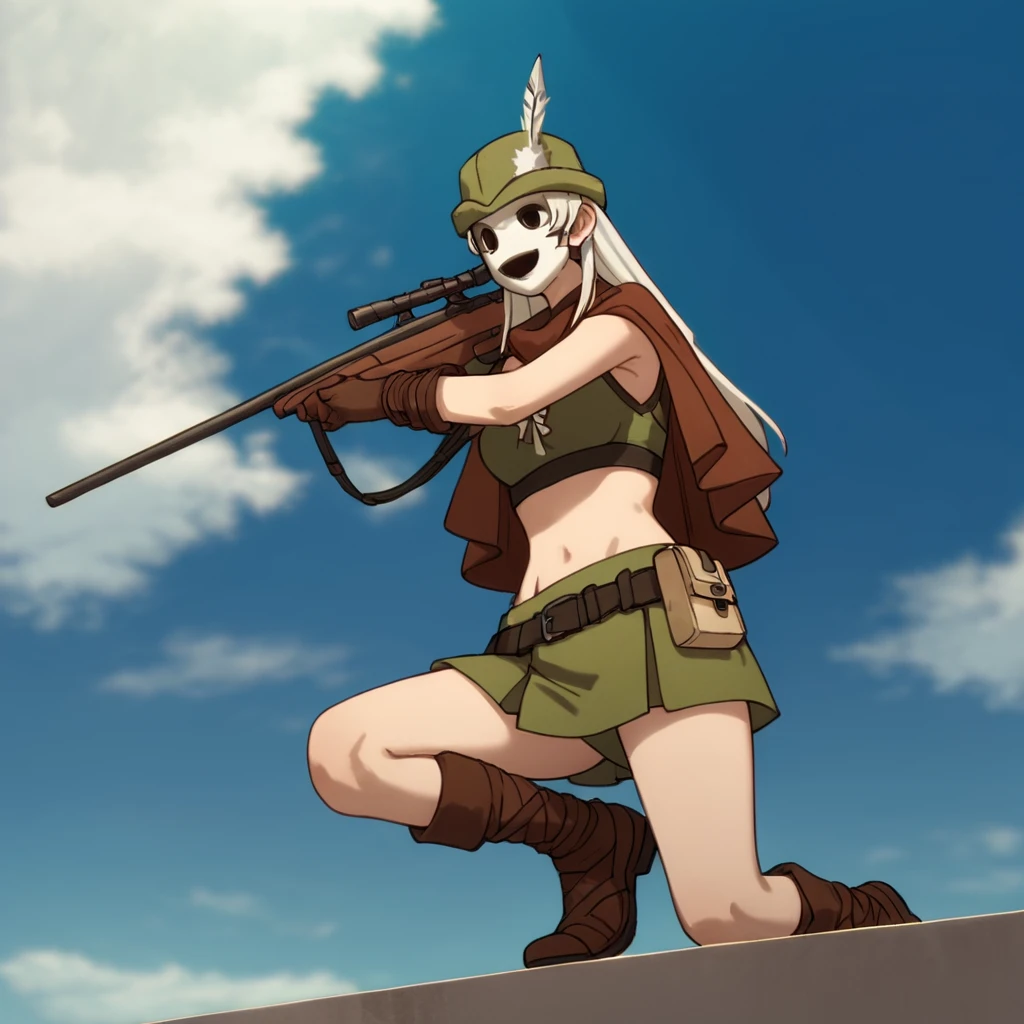 White Feather Mask, a long-haired, busty woman in hunter's attire, wields a sniper rifle similar to the Sniper Mask's. Her signature white feather adorns her hat, adding to her distinctive look. As a tsundere psychopath, she combines a fierce attitude with a dangerous unpredictability, making her a lethal presence. Her murderous tendencies and complex personality add layers of tension and intrigue to the high-stakes world of Highrise Invasion.