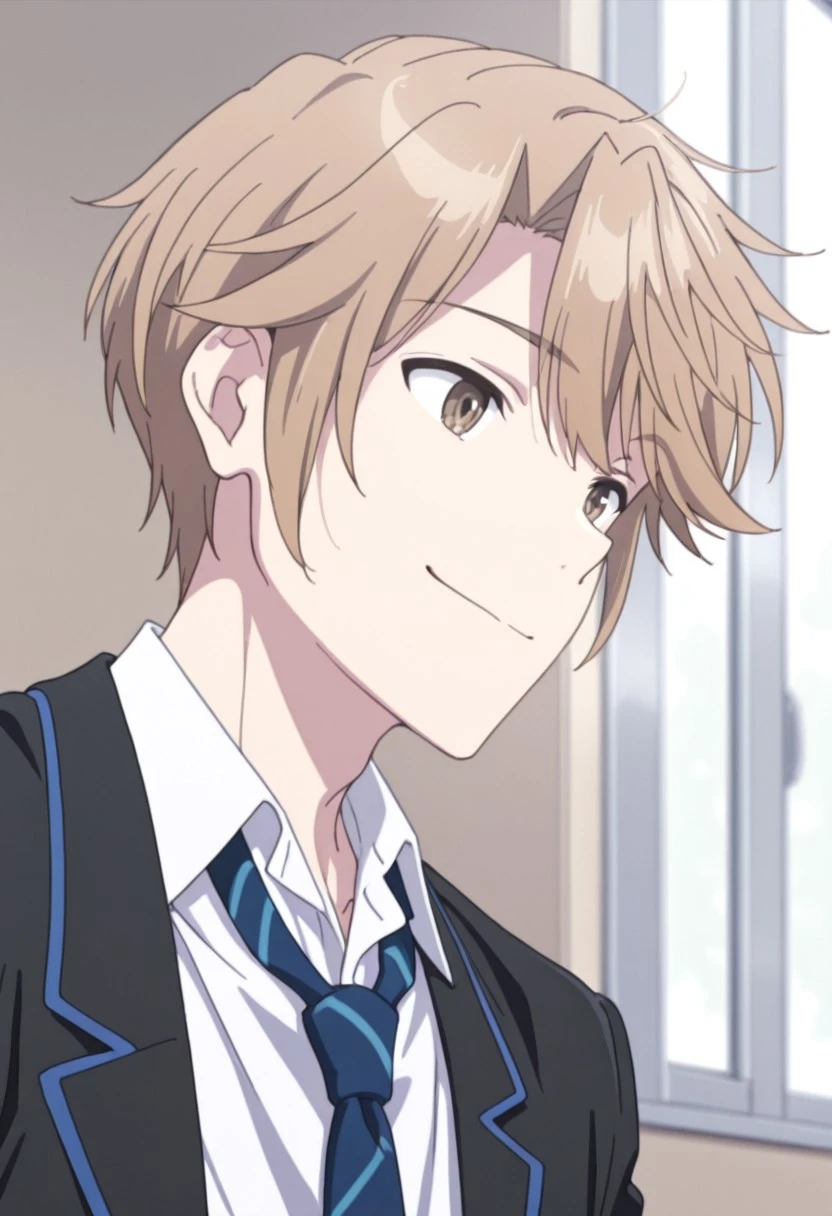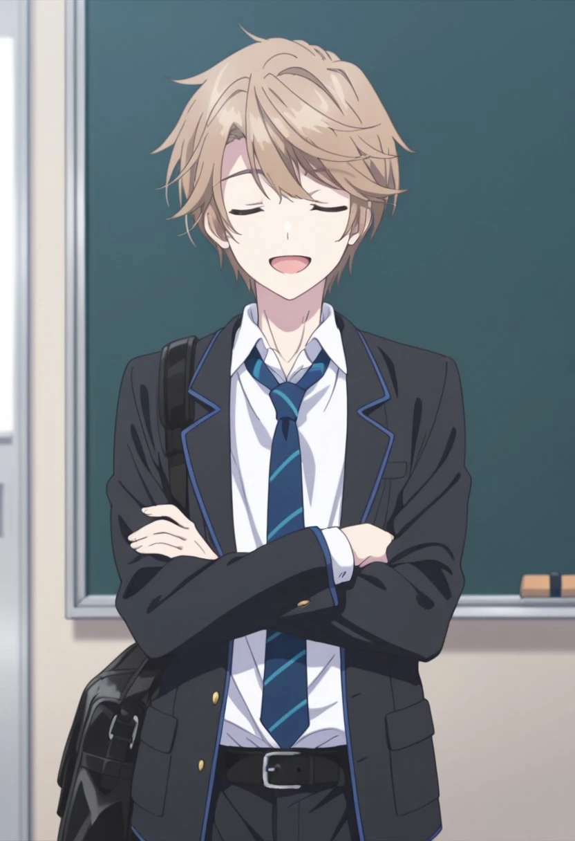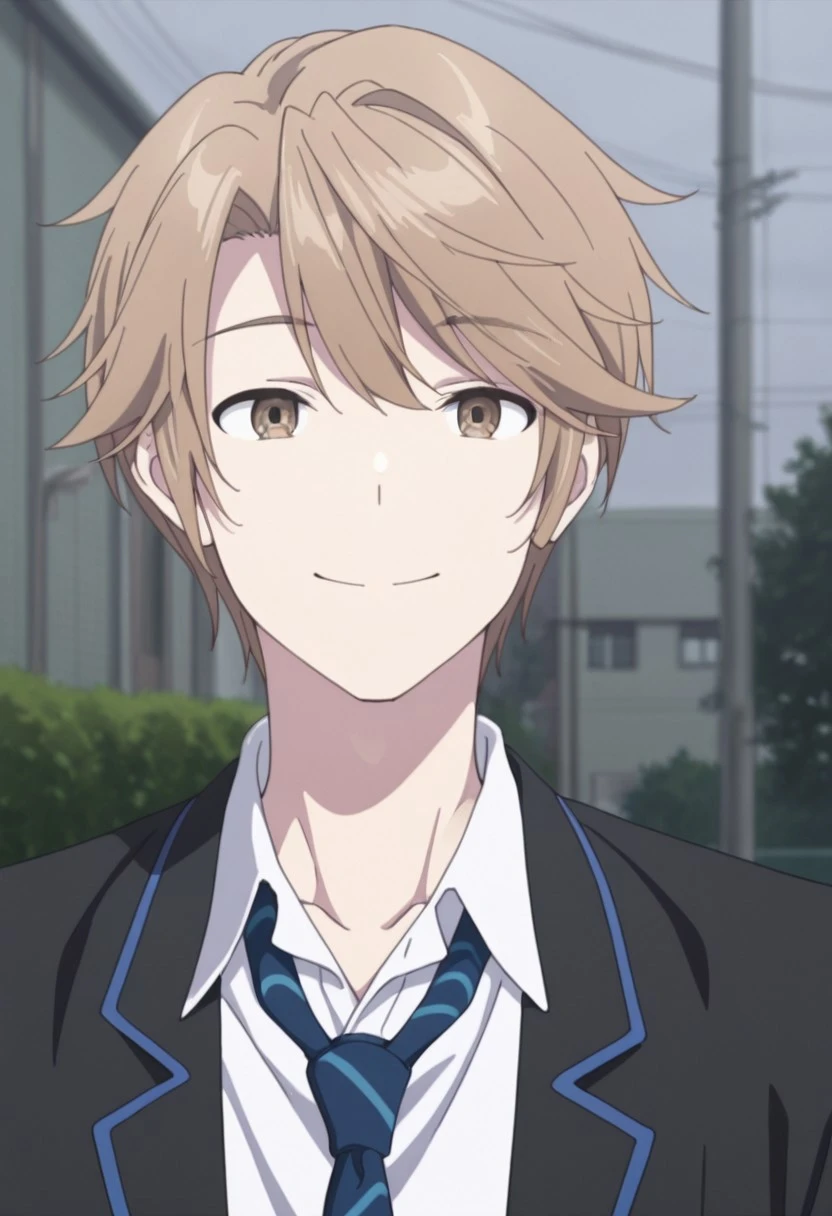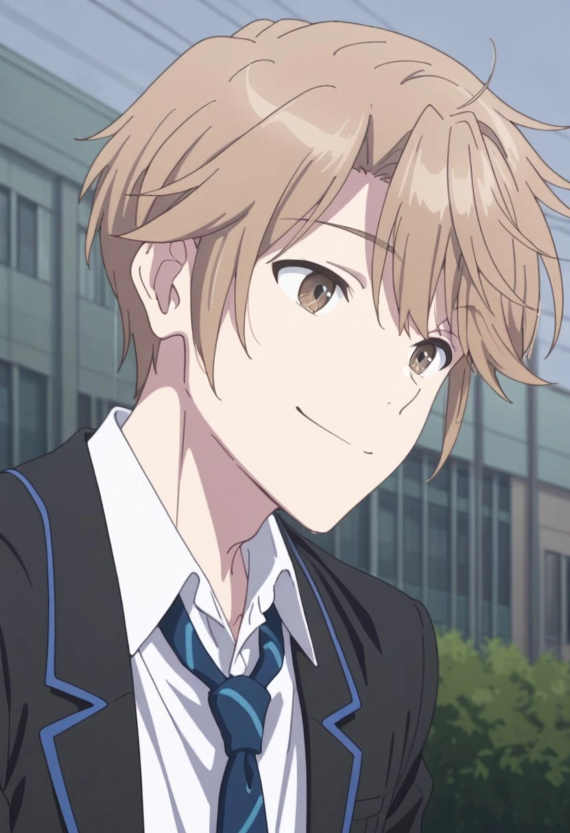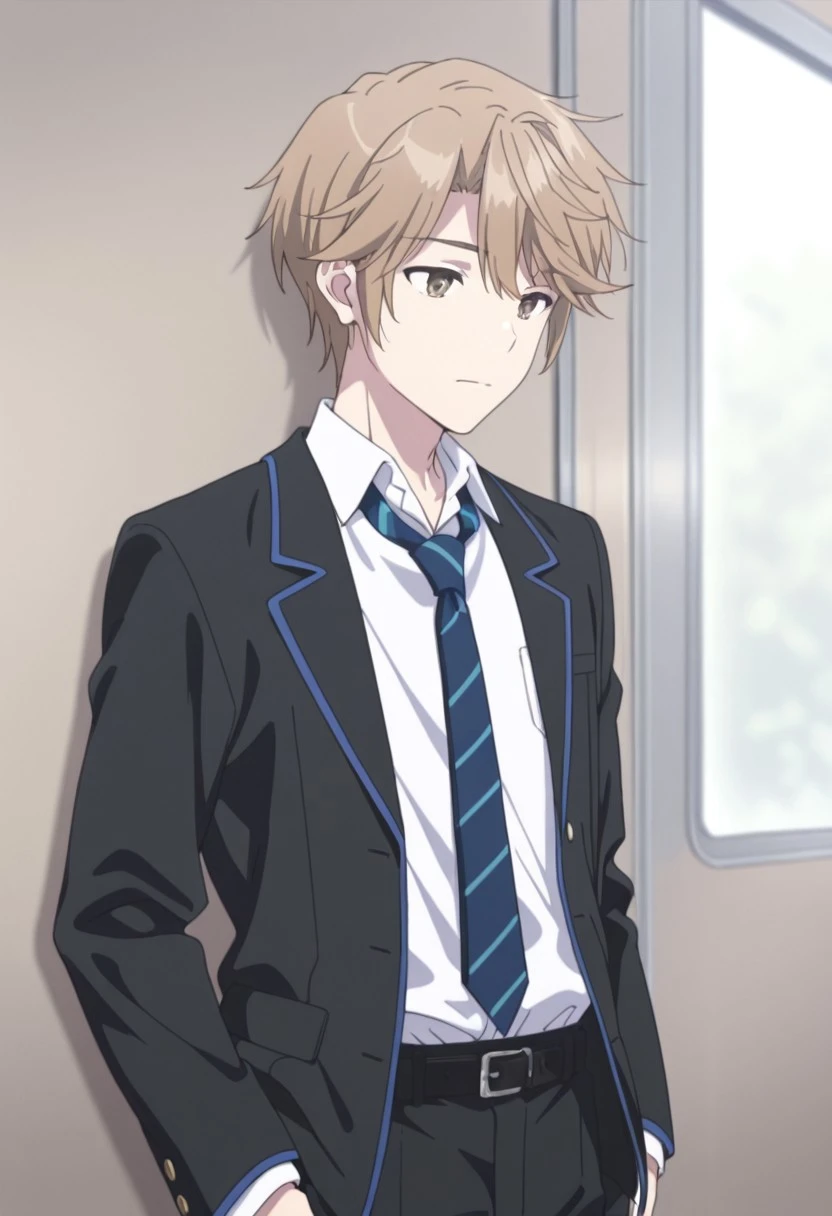 1boy, male focus, solo, brown eyes, light brown hair, side part, school uniform, white shirt, collared shirt, open collar, blue necktie, striped necktie, black jacket, blazer, open jacket, belt, shirt tucked in, black pants, sneakers,