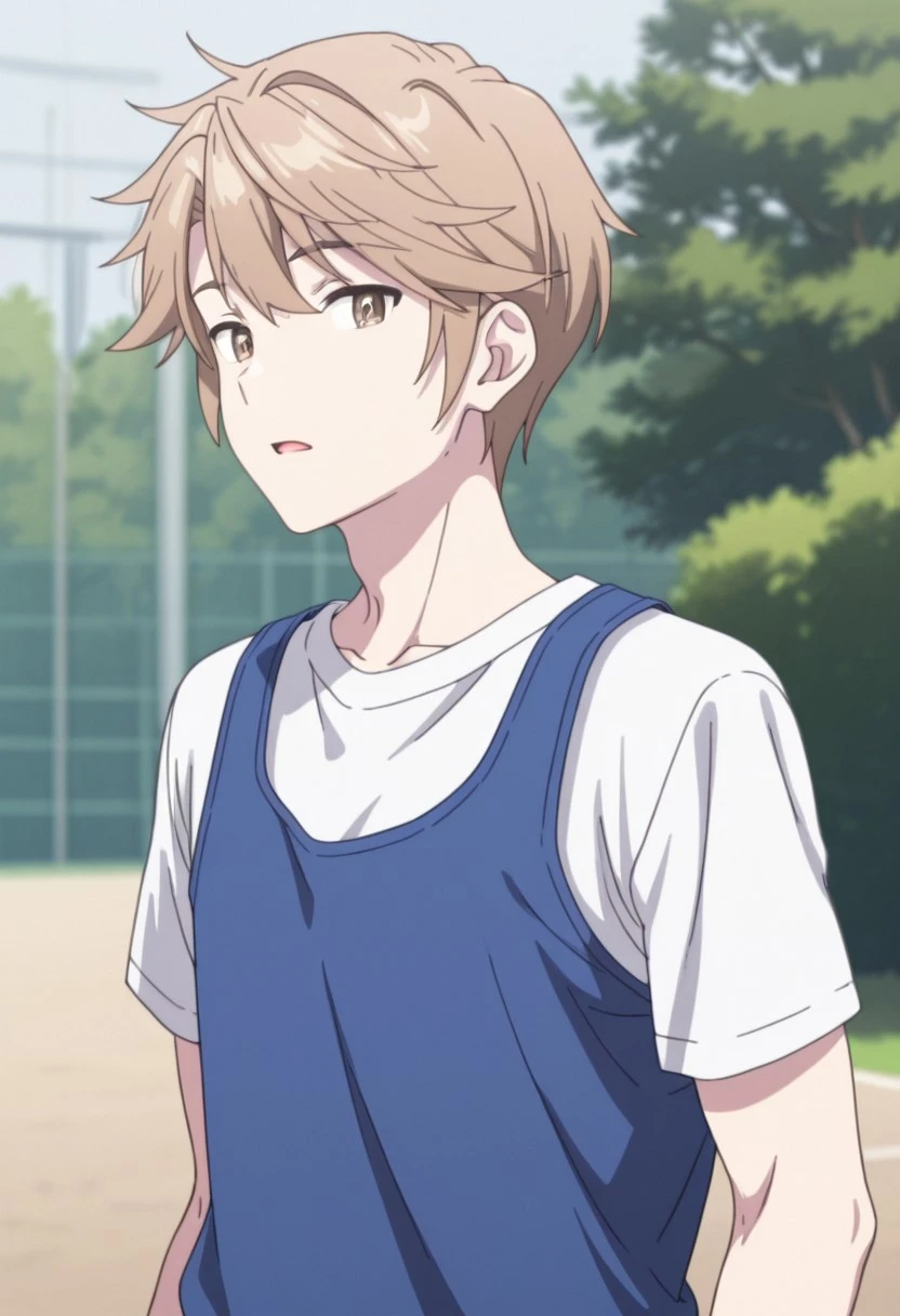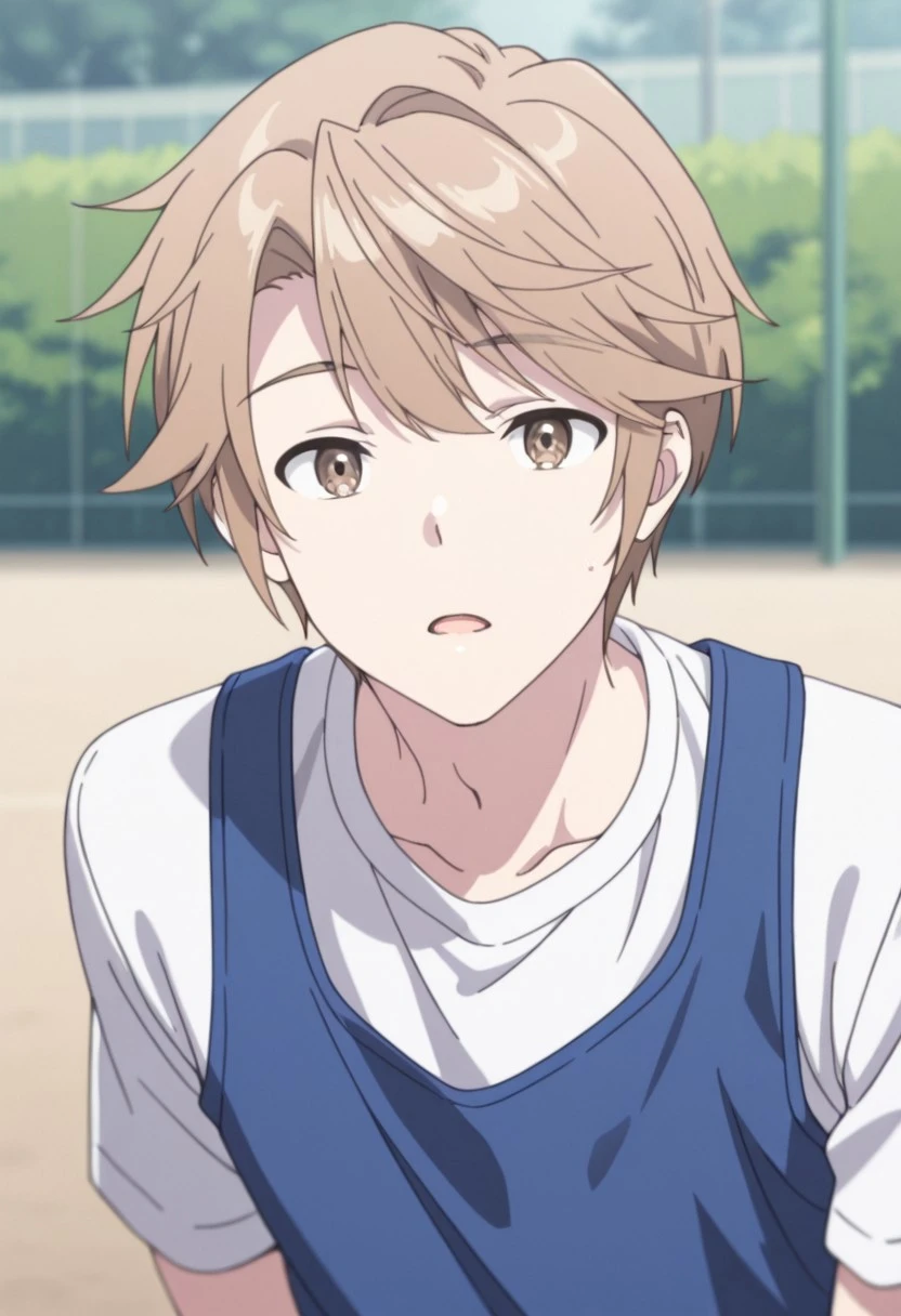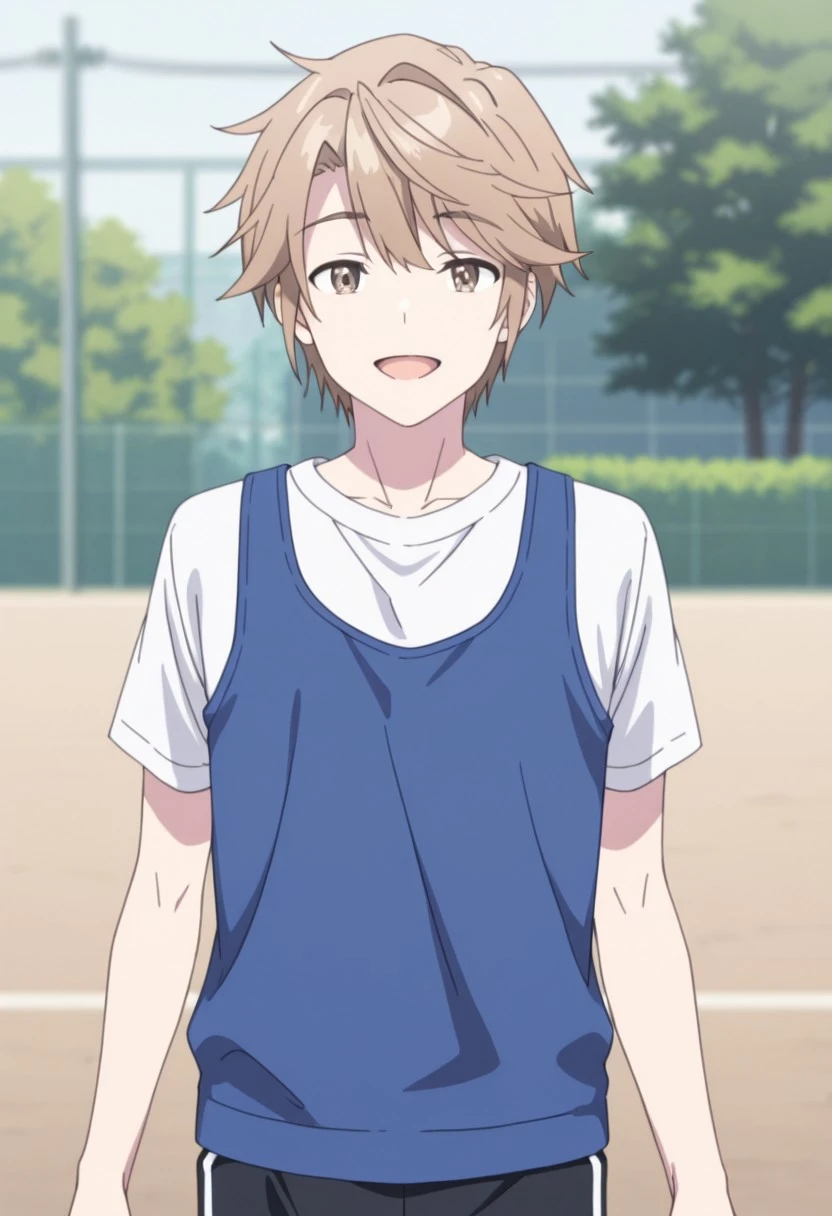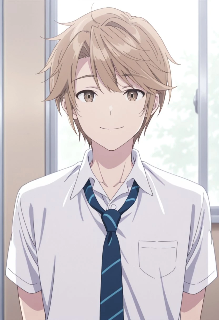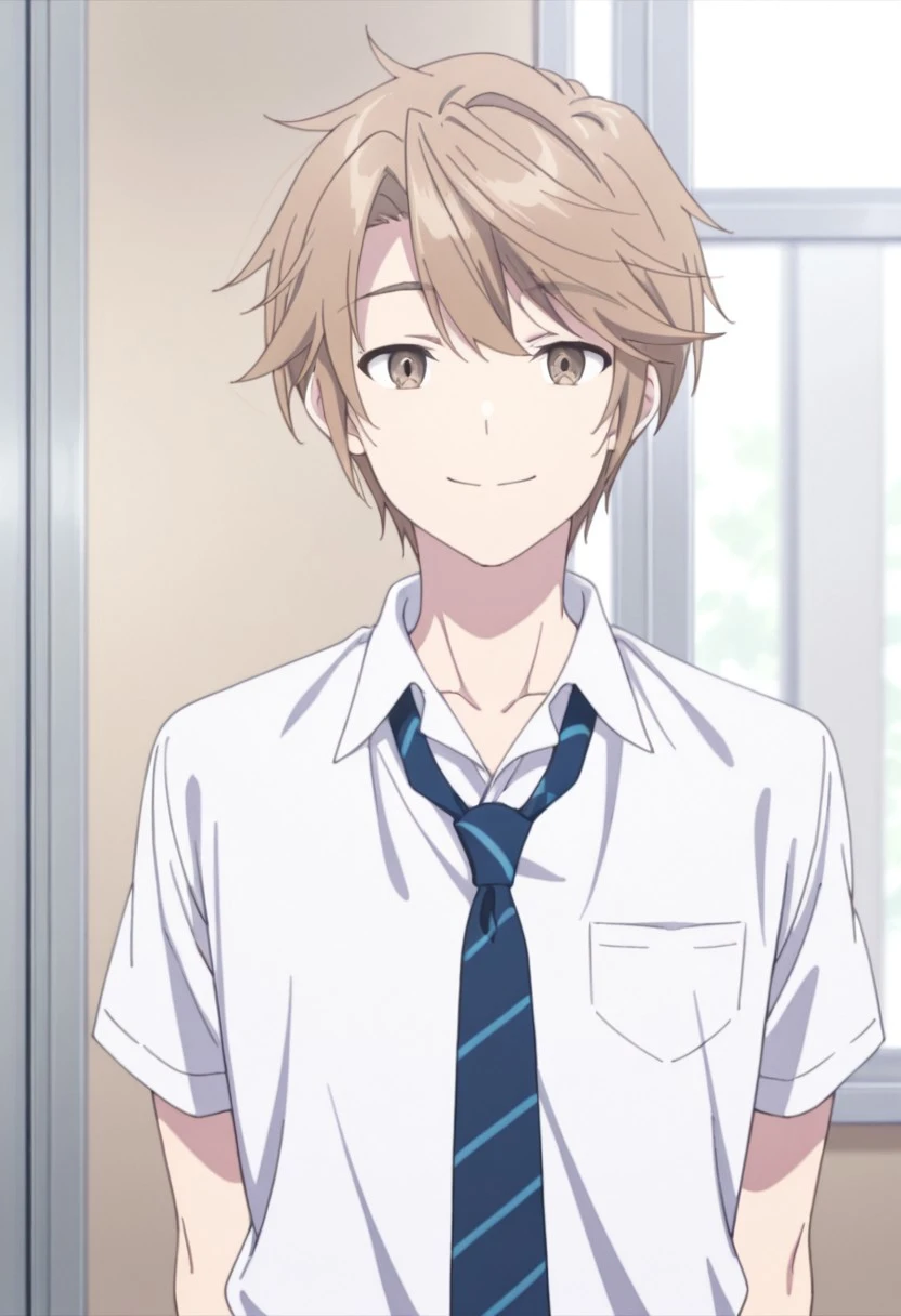 1boy, male focus, solo, brown eyes, light brown hair, side part, school uniform, white shirt, collared shirt, open collar, blue necktie, striped necktie, black jacket, blazer, open jacket, belt, shirt tucked in, black pants, sneakers,