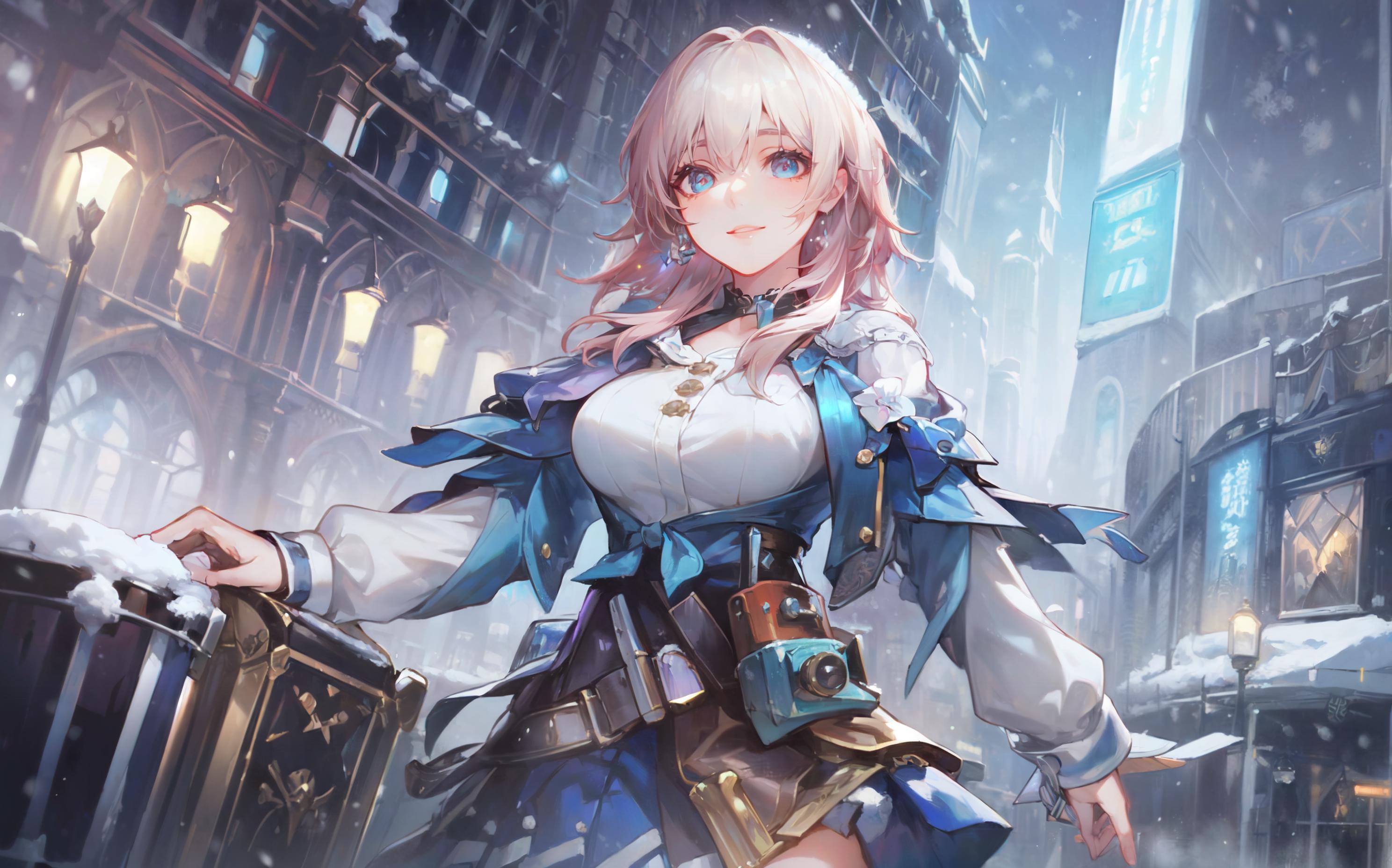 To summon her use the trigger Tags plus following tags: 1girl, solo, pink hair, bangs, looking at viewer, smile, long sleeves, white shirt, open mouth, blue eyes, blue jacket, skirt, breasts
