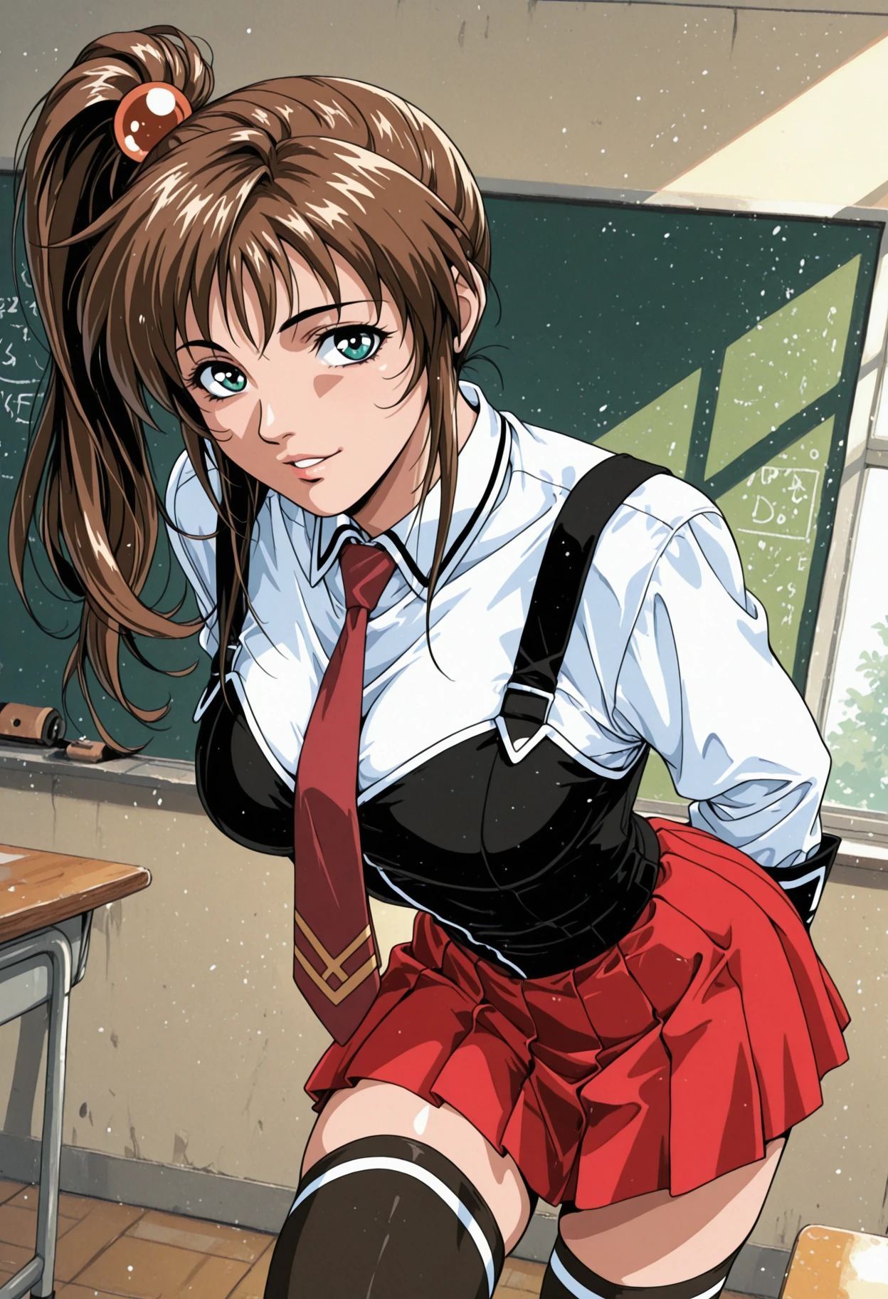 imabib, brown hair, side ponytail, hair ornament, green eyes, large breasts