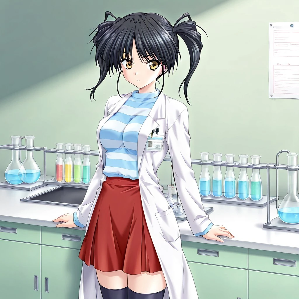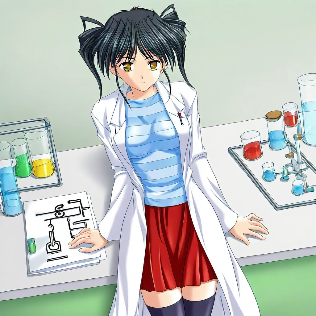 Extra: striped shirt, long sleeves, red skirt, thighhighs, zettai ryoiki, labcoat