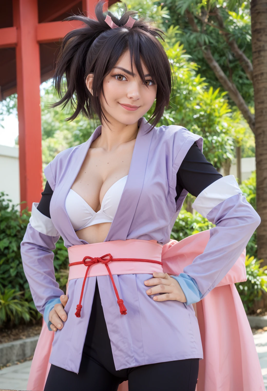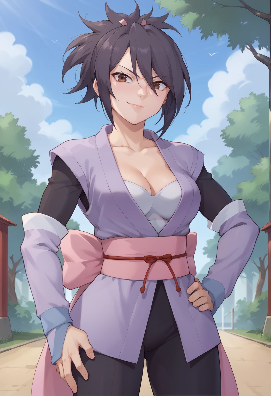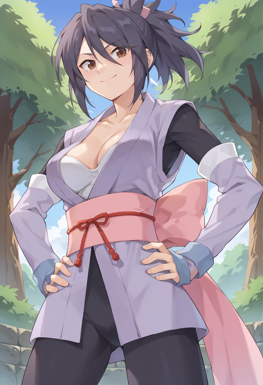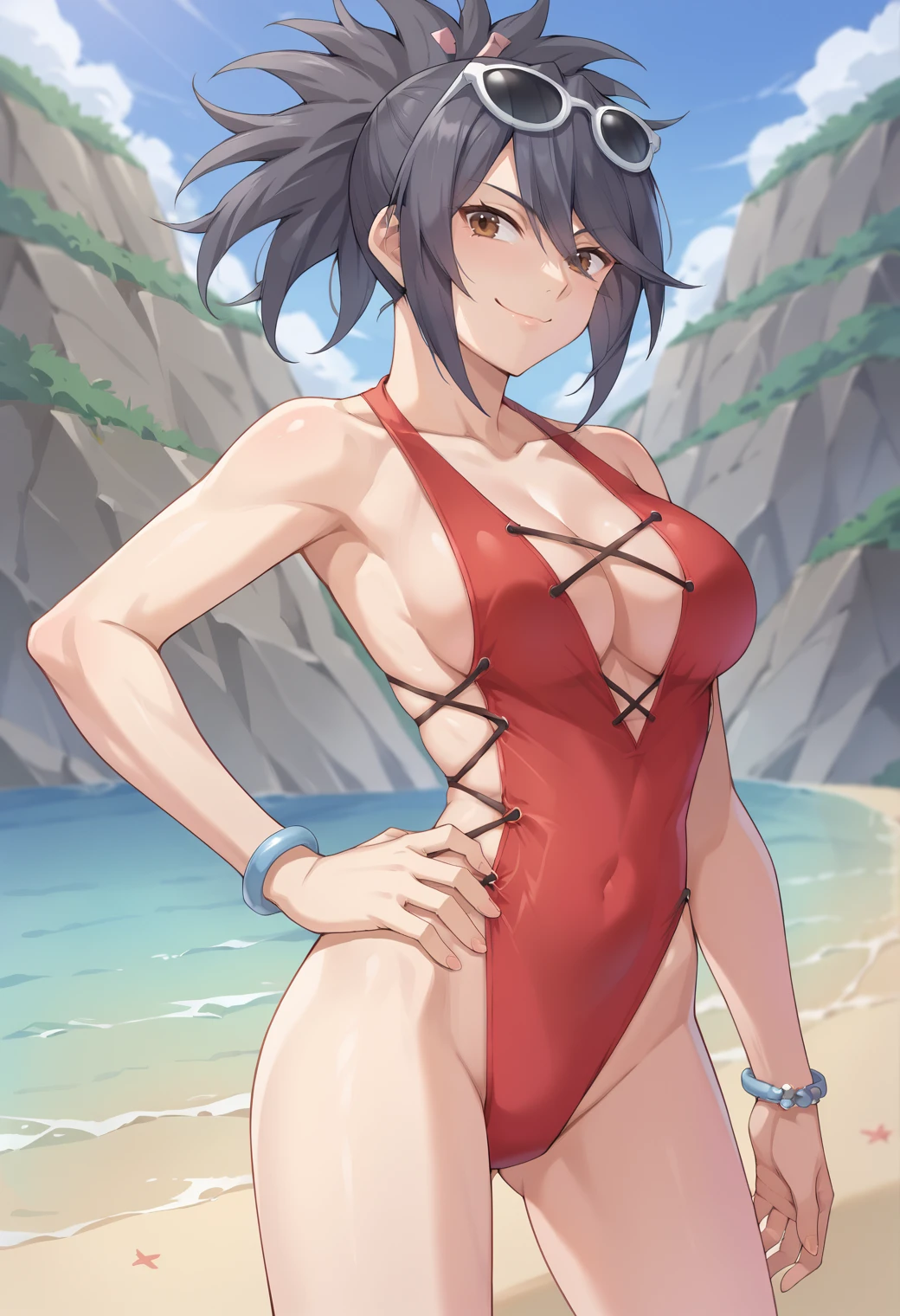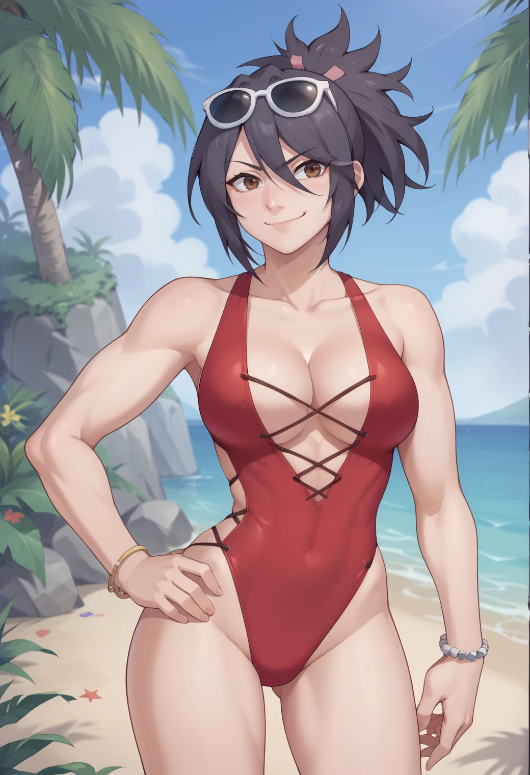 It should be able to make both outfits pretty well, The trigger words are "sheena_fujibayashi" and to get her default use "defsheena" this seems to work well enough on it's own, but you can add "Japanese clothes, white bra, cleavage, detached sleeves, obi, pantyhose" and add "boots" when you do full body. Use "swimsheena" for her swimsuit and add "red one-piece swimsuit, cross-laced clothes, cleavage, bracelet, eyewear on head" it doesn't quite get the side of the swimsuit right, also might need "Japanese clothes, white bra" in the negative. It seems to add the "hair ribbon" on it's own, but use the tag as needed.