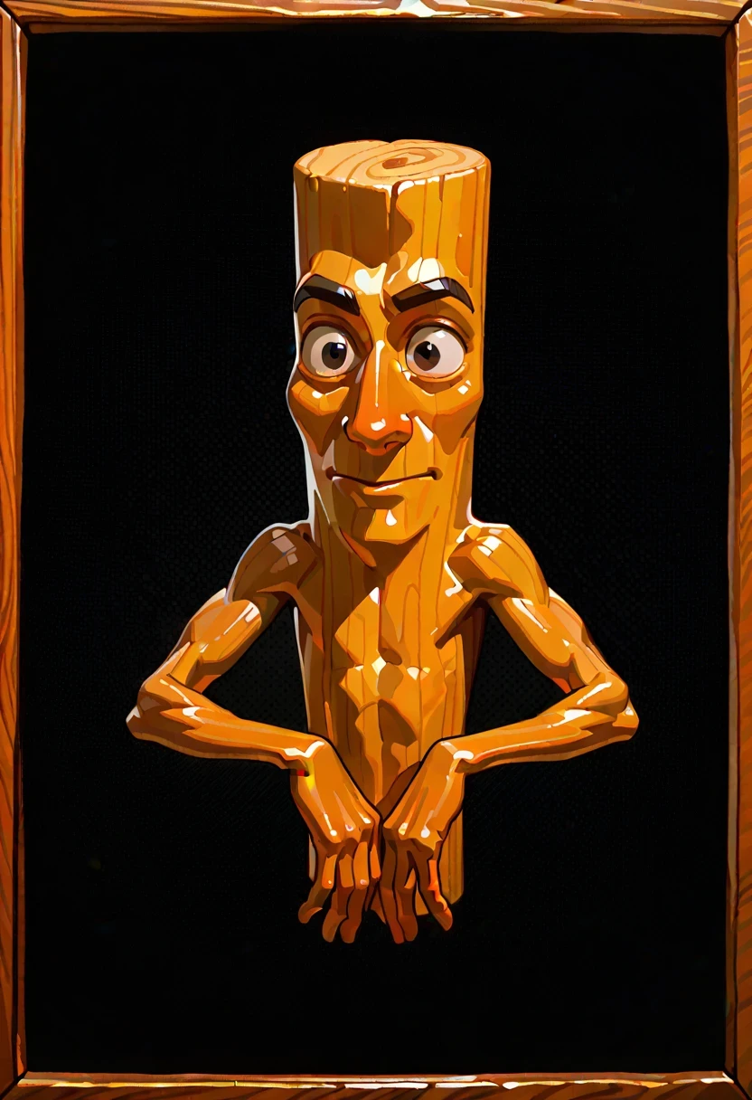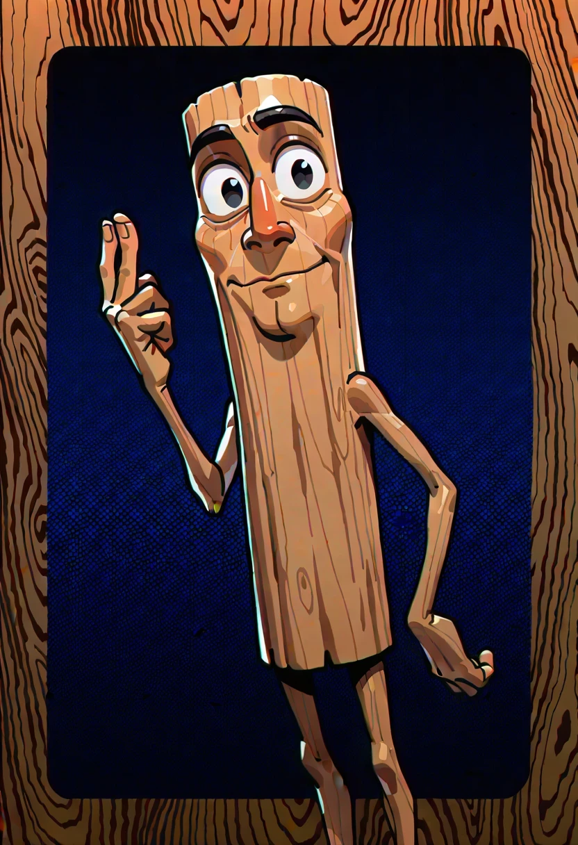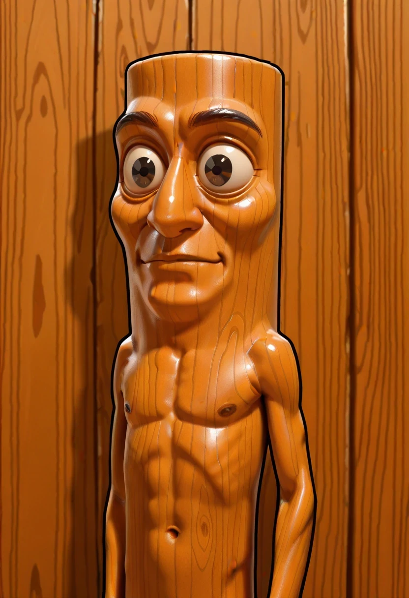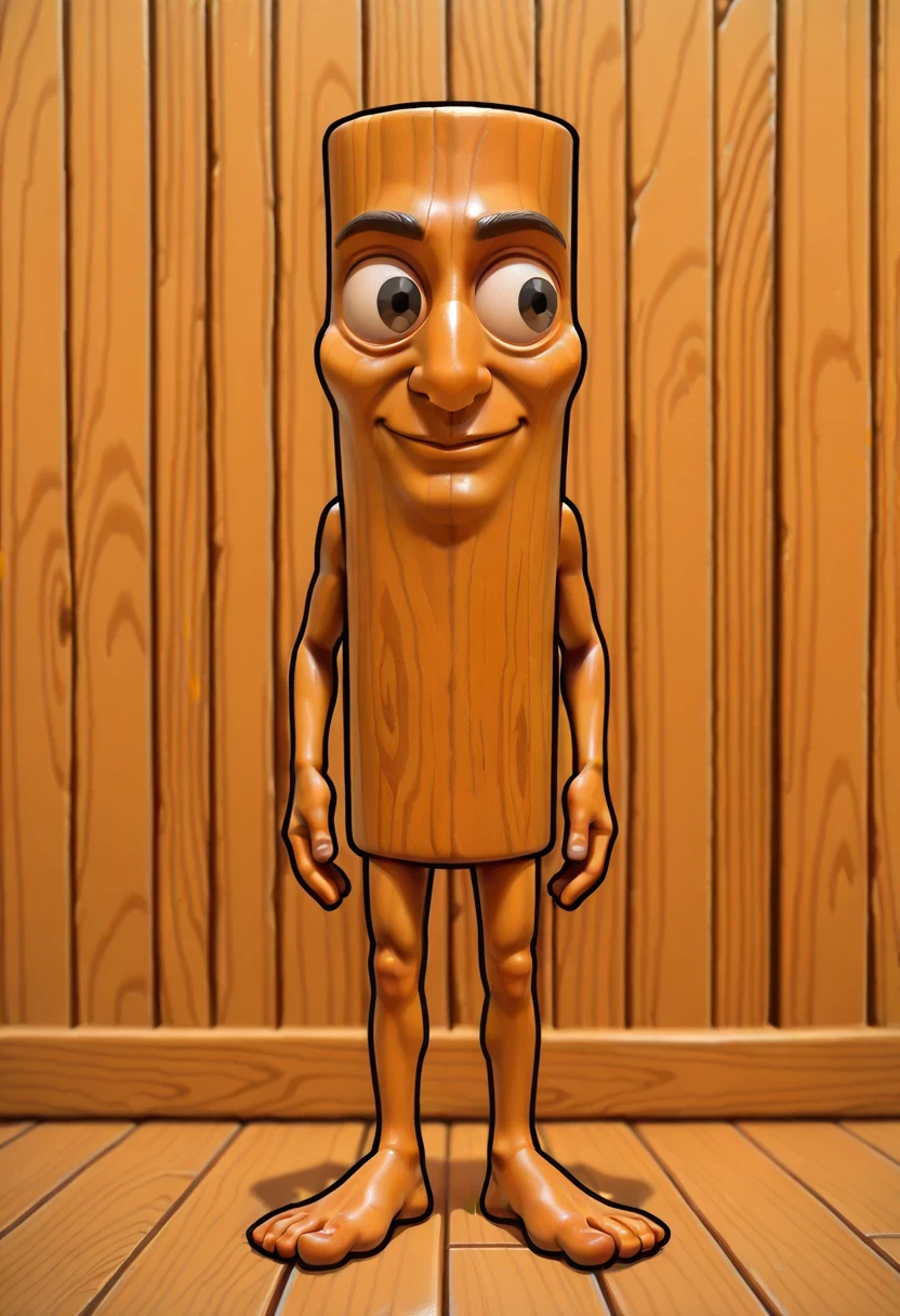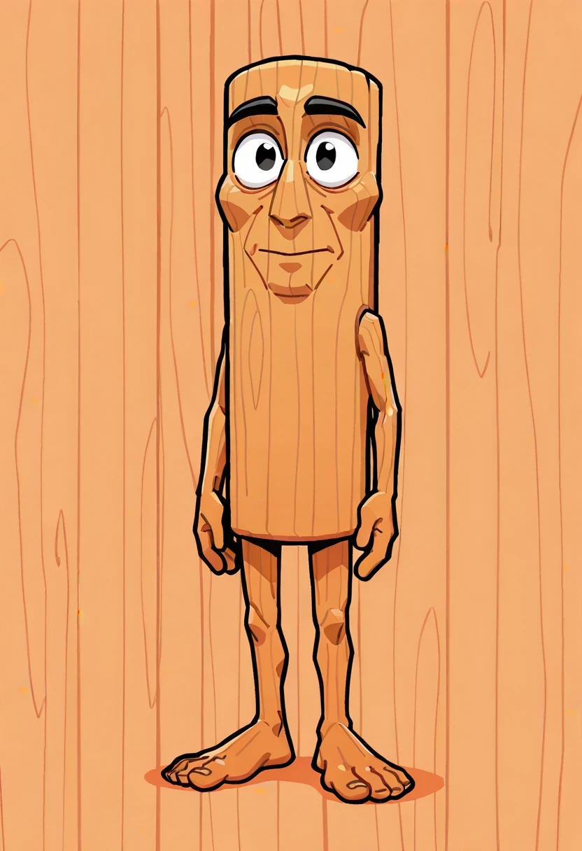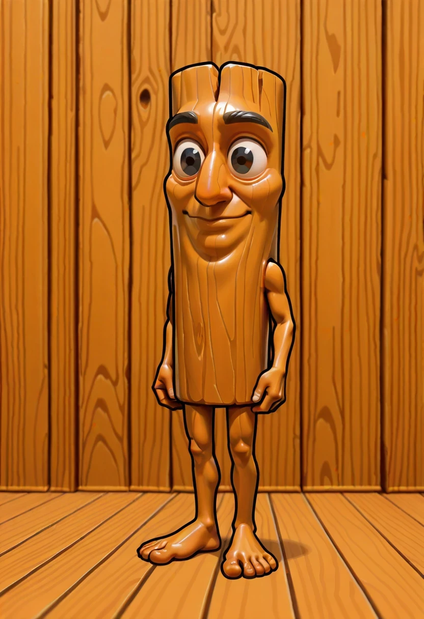 ungTungTungSahur, 1boy, cartoonish wooden humanoid character, brown wooden body, elongated brown limbs, large exaggerated brown feet, humanoid nose, black eyes, black eyebrows,