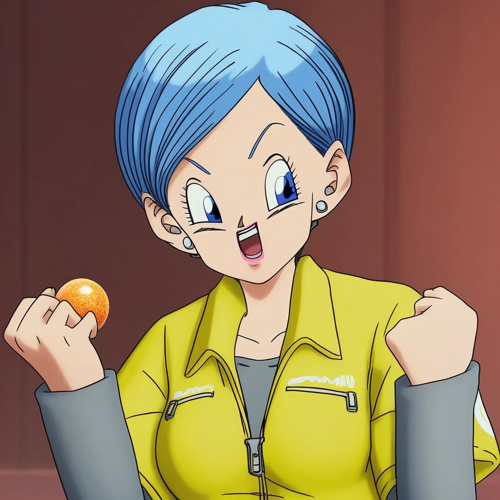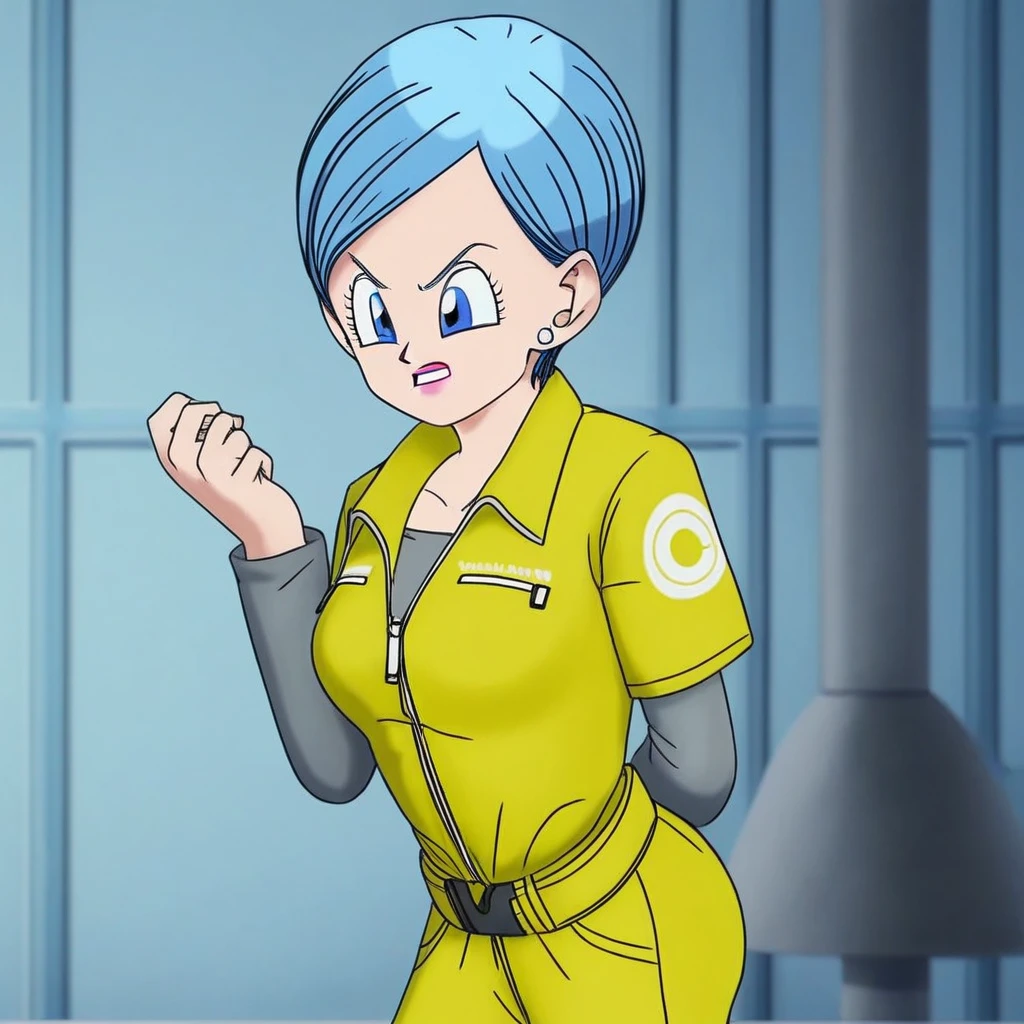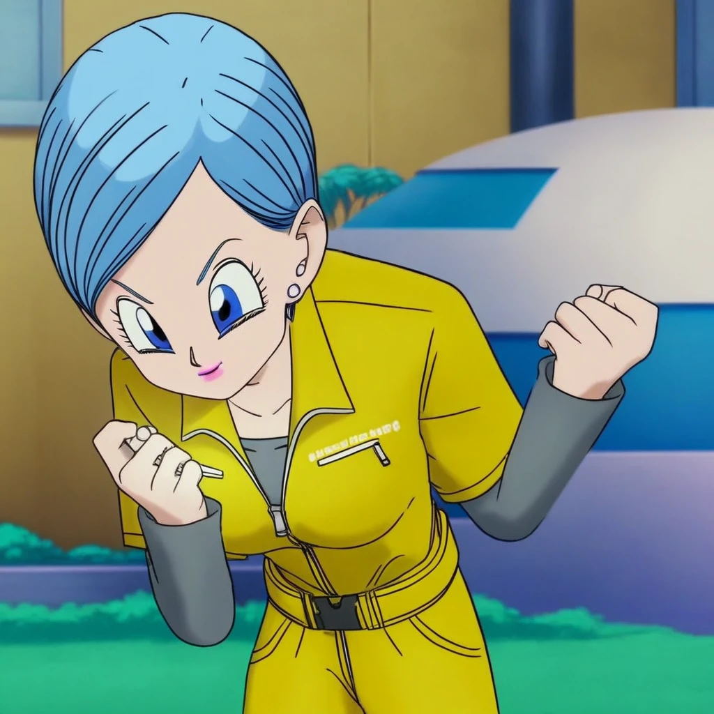 Bulma, blue eyes, short blue hair, pink lipstick, earring, gray long-sleeved undershirt, yellow short sleeve jumpsuit, belt, orange shoes
