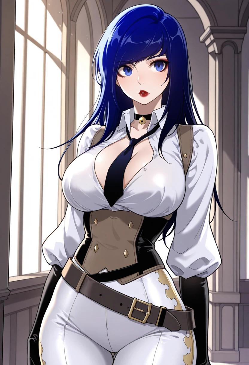 white shirt,neck bell, black necktie, corset, white pants, belt, gloves, black footwear,Description