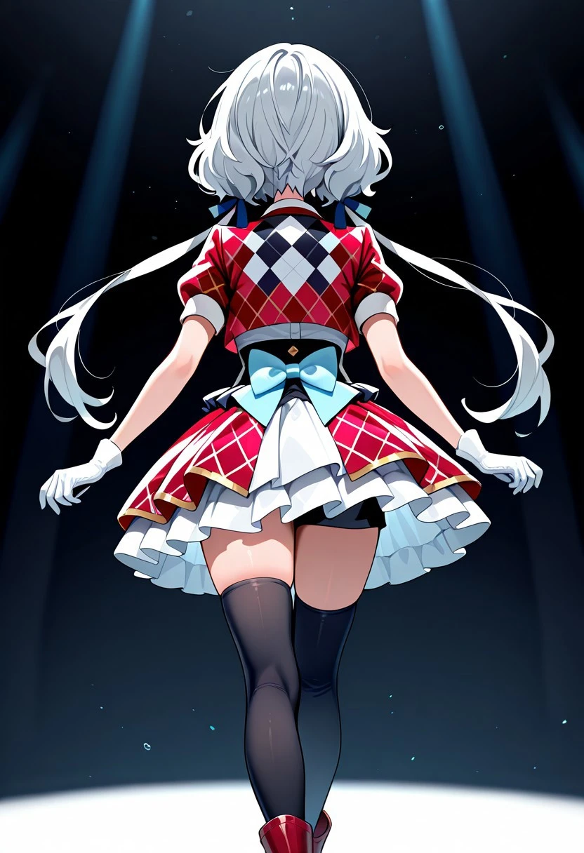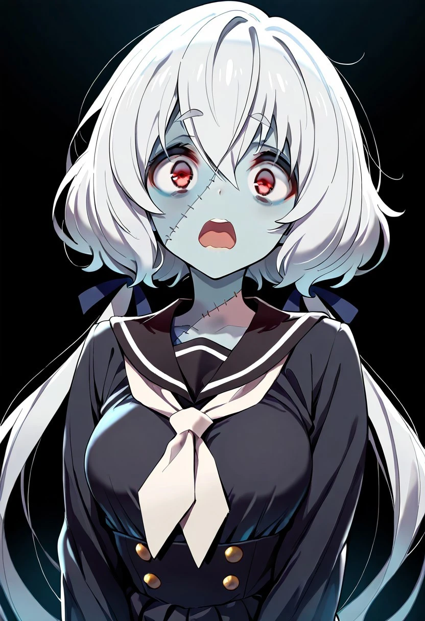 patchwork skin, stitched face, blue skin, low twintails, hair ribbon