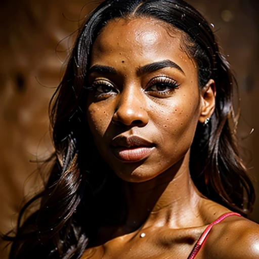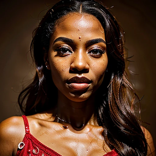 (best quality,ultra-detailed,realistic:1.37),portrait,detailed eyes,beautiful lips,[black african influencer],long hair,strawberry red,medium:portrait photography,wear dress
