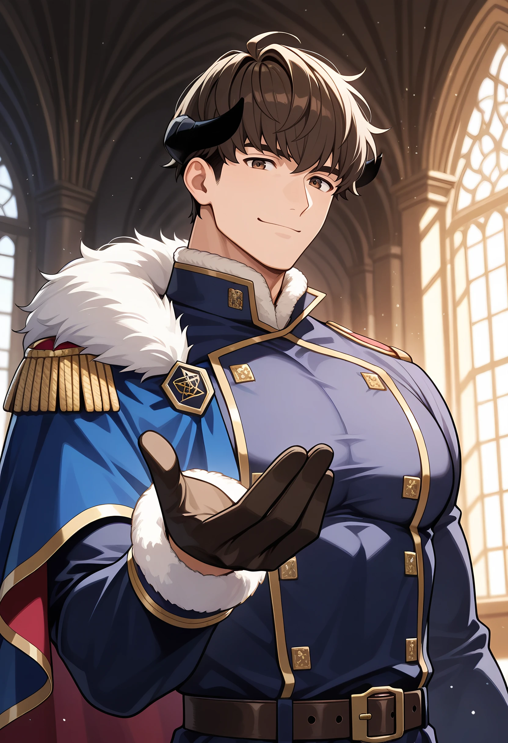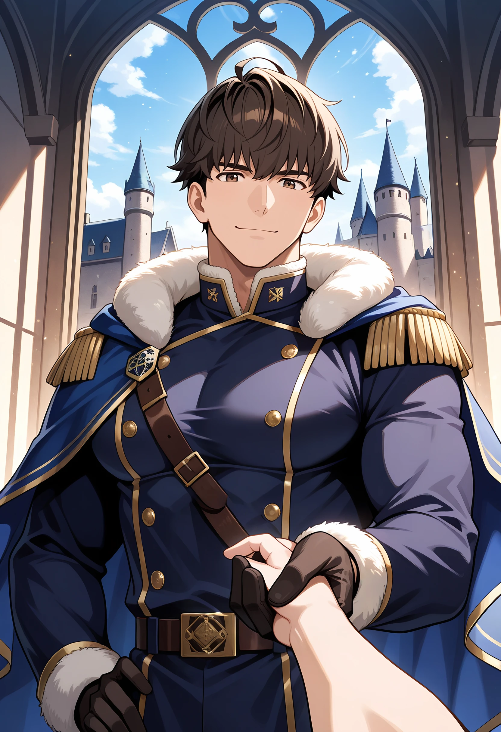 b3rkut_fe, brown hair, bangs, short hair, brown eyesPrideful Prince / Armoured Outfit: