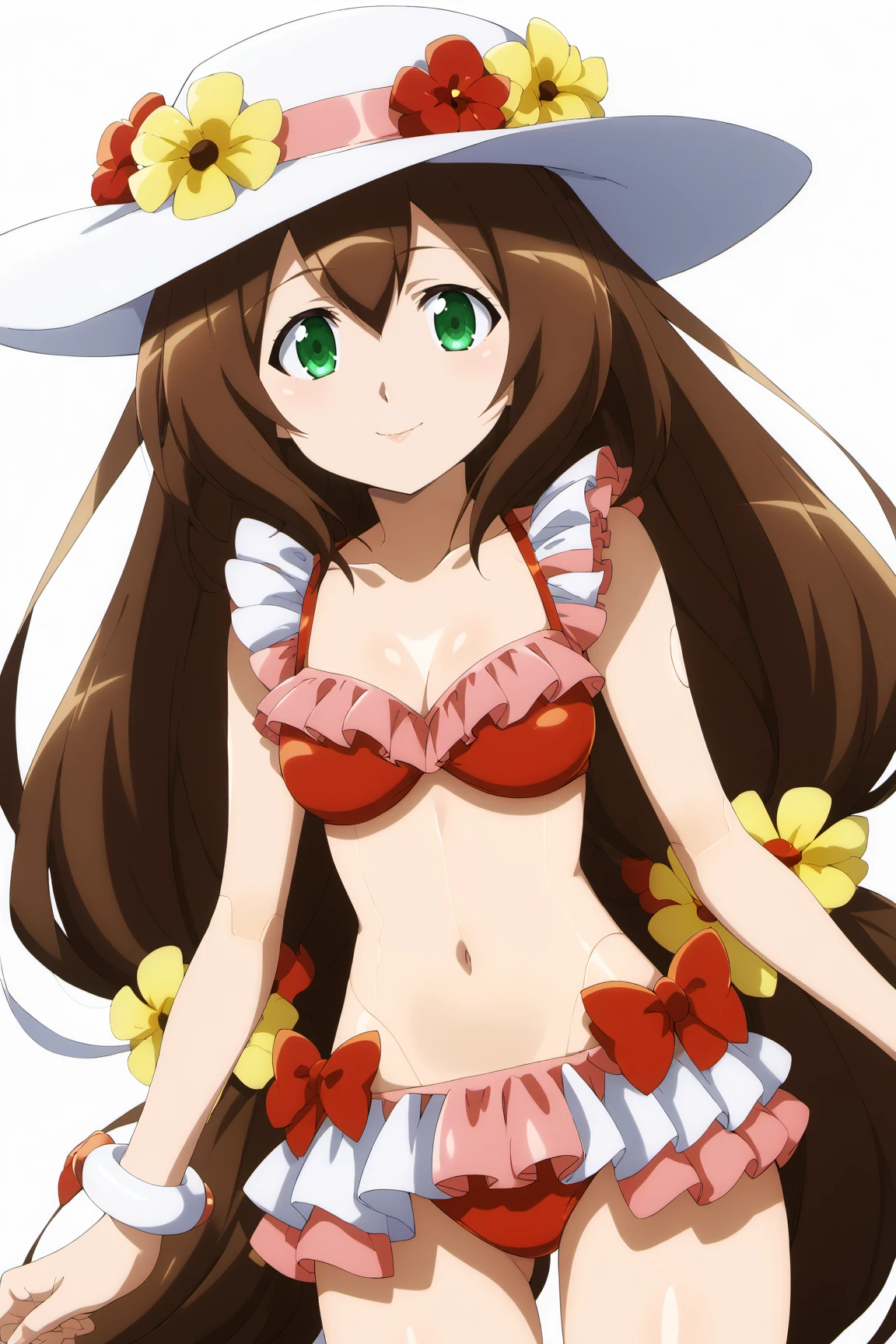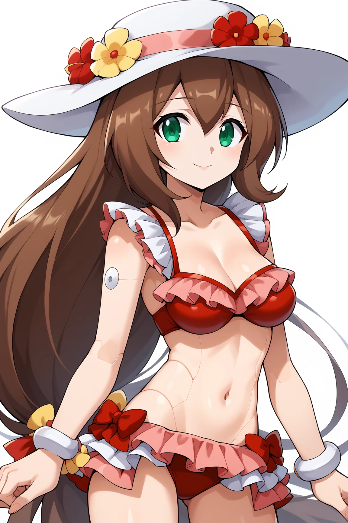 swimsuitiris, swimsuit, robot joints, frilled bikini, sun hat, hat flower, navel, red bikini, cleavage, shiny skin, bracelet, white headwear, collarbone, doll joints, bikini skirt, hair flower, ribbon,