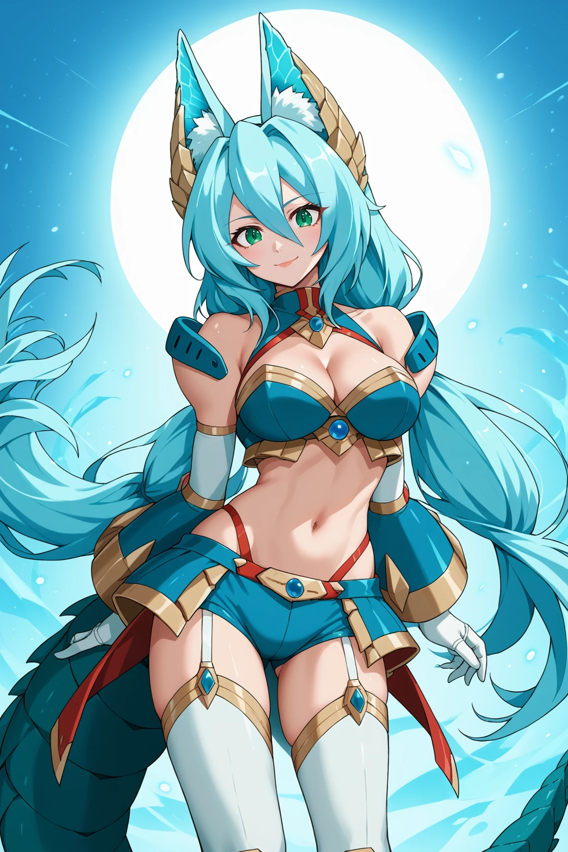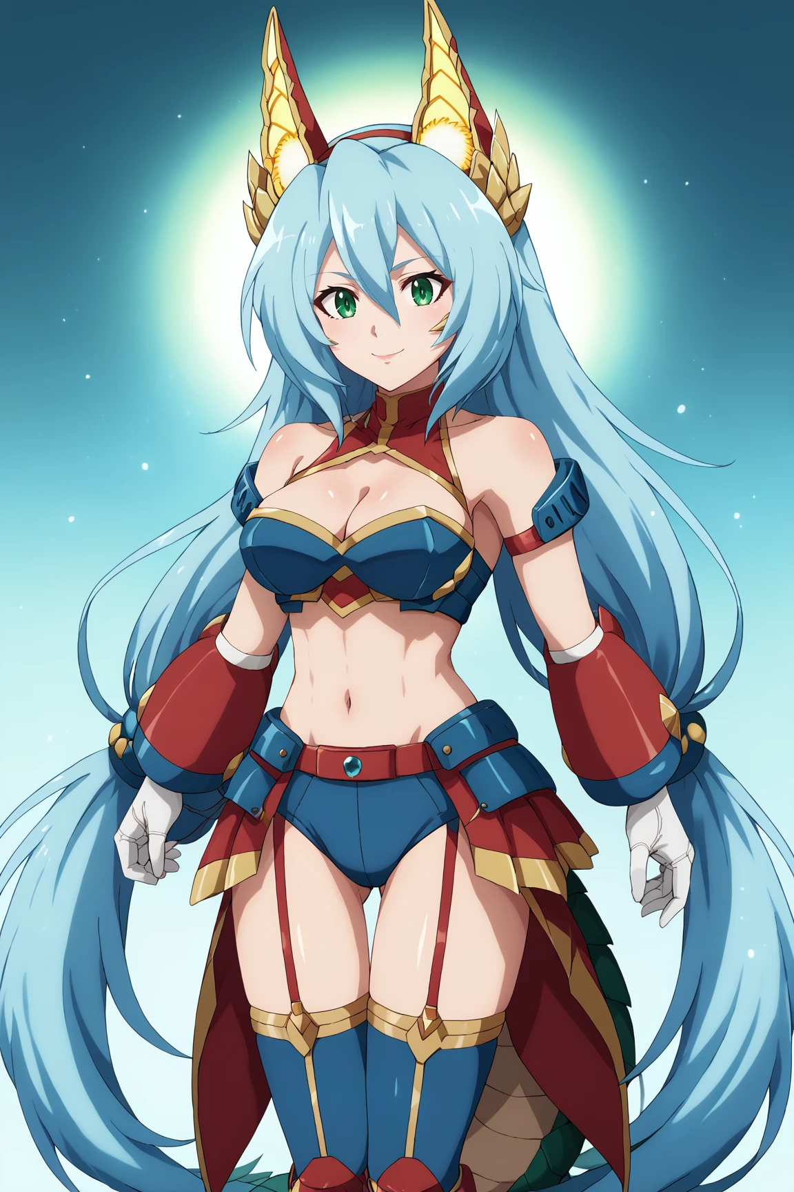zinogreiris, light blue hair, white gloves, midriff, low twintails, dragon tail, fake animal ears, cleavage, garter straps, dragon girl, bare shoulders,
