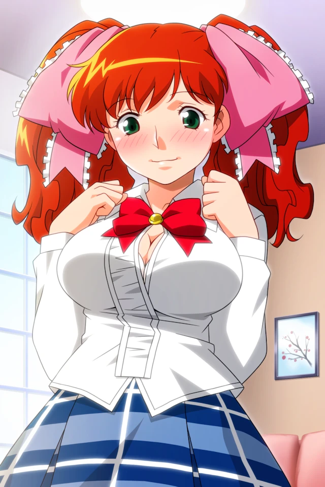asahina yurina, tanaka ryou, red hair, long hair, curly hair, twintails, pink bow, hair bow, green eyes, medium breasts
