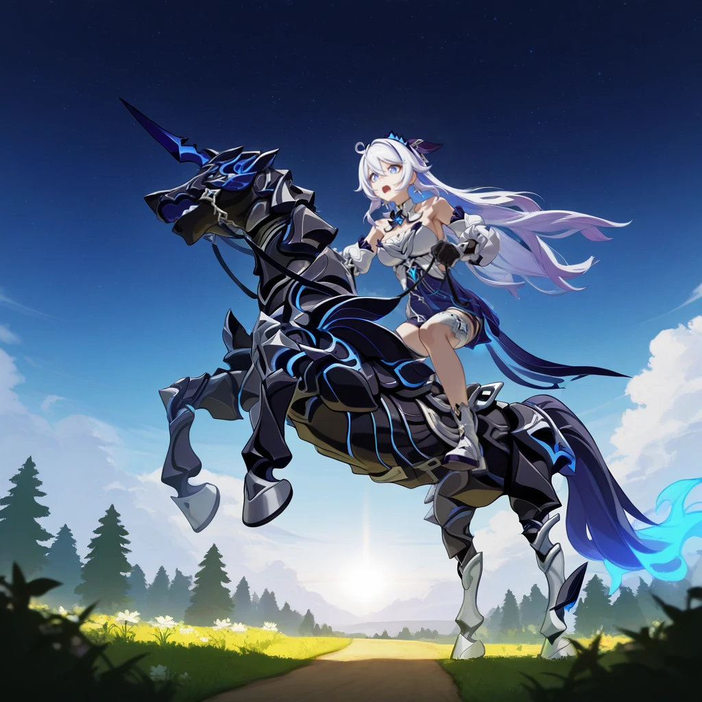 DuduKrsh, DSp_RidKr, horseback riding, riding, holding reins, horse, blue trim, black horse, barding, saddle, fiery tail, blue tail, reins, black armor, armor, hooves,