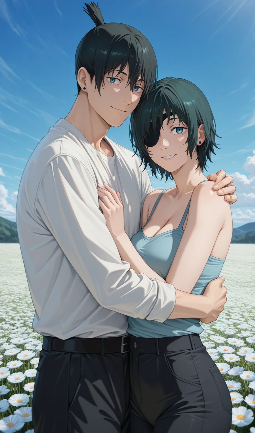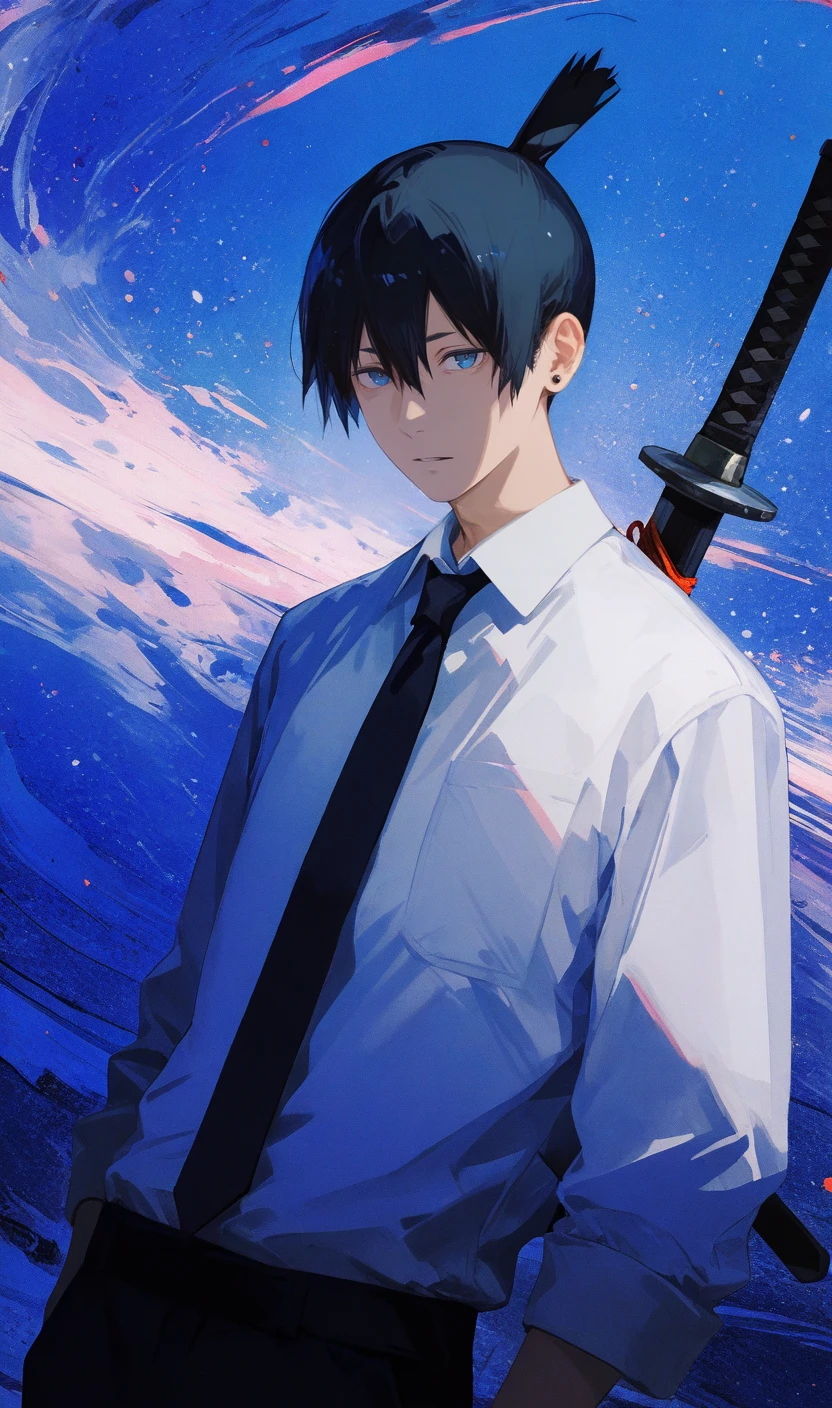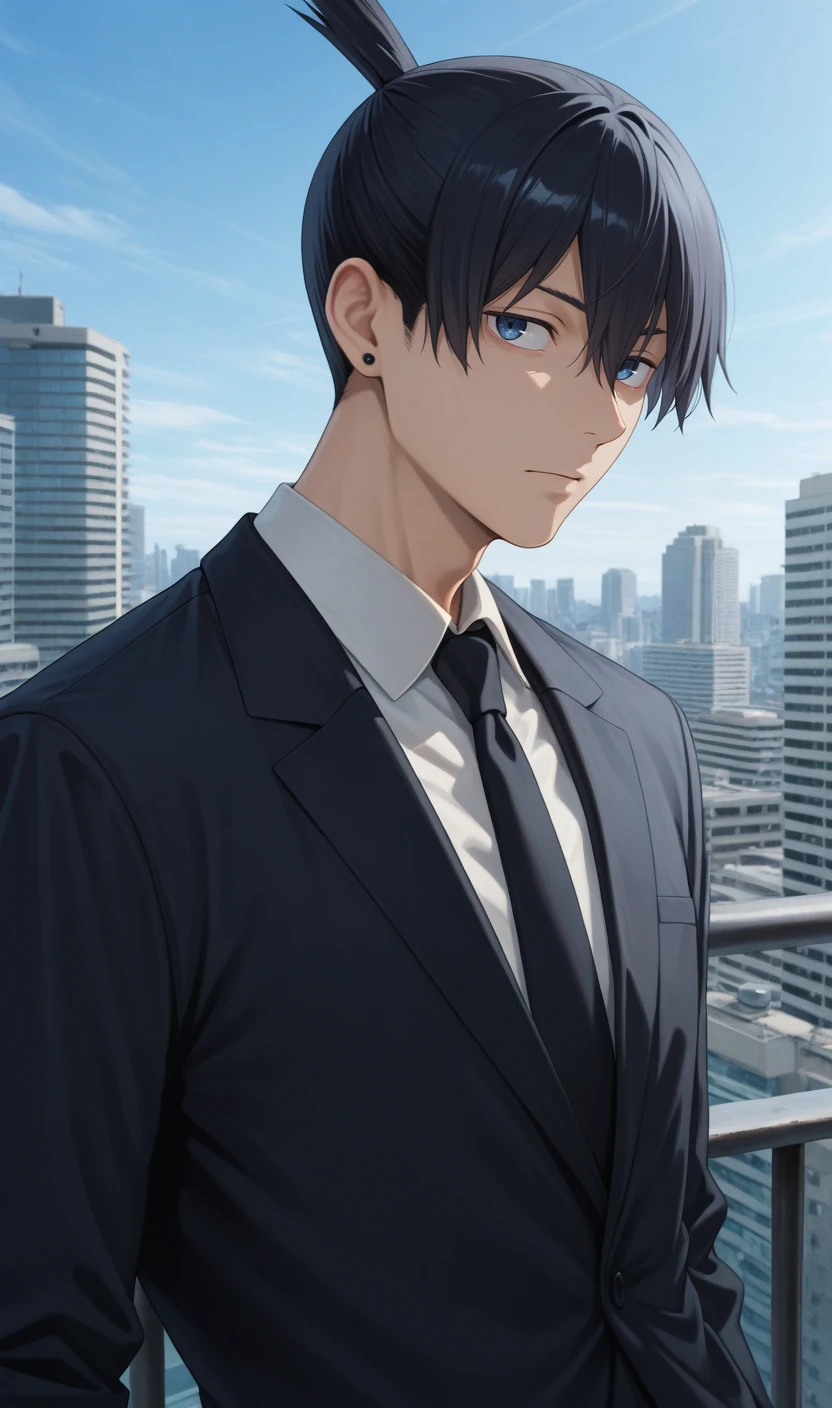 1boy, male focus, hayakawa_aki, aki hayakawa, blue eyes, piercing, black hair, short ponytail, black suit, white shirt, black necktie, anime style,