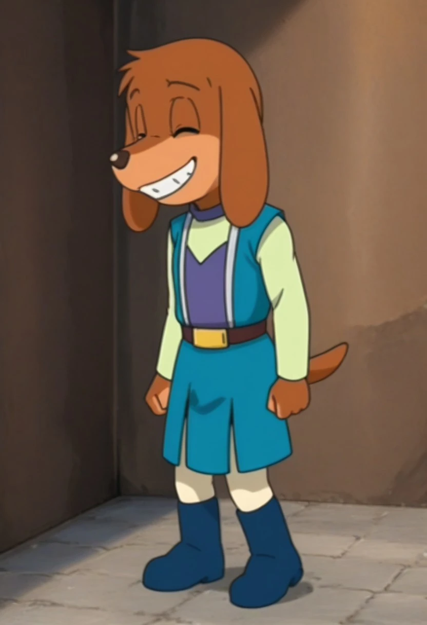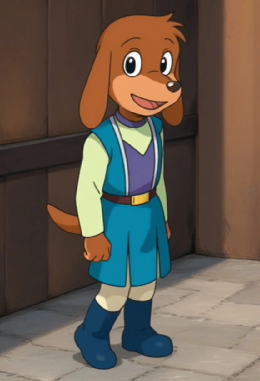 looking at viewer, body fur, dog, dog boy, furry, 1boy, solo, furry male, male focus, brown hair, animal ears, dog ears, black eyes, animal nose, shirt, vest, long sleeves, belt, tail, dog tail, boots, blue footwear