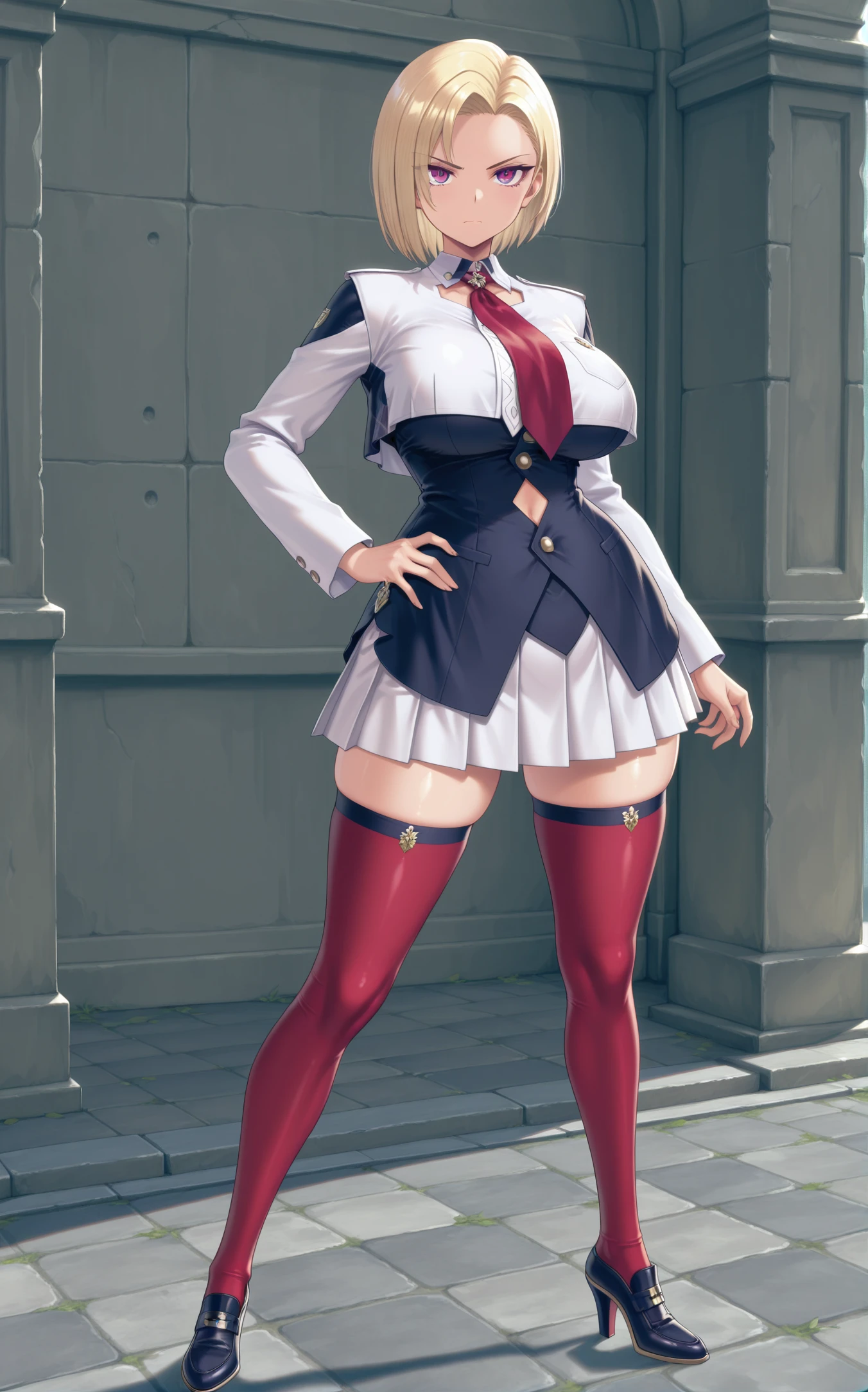 school uniform, cropped jacket, miniskirt, white skirt, pleated skirt, red thighhighs, high heels,