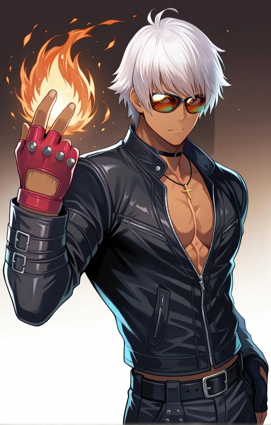 black jacket, leather jacket, pectoral cleavage, red glove, cross necklace, fingerless glove, black glove, black belt, black pants, black choker,