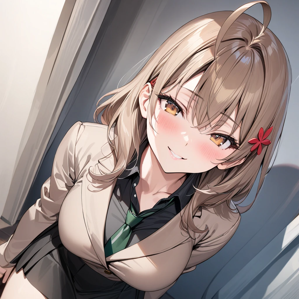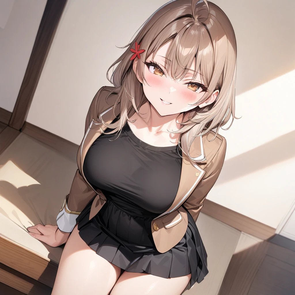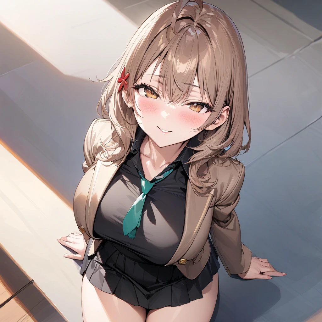Activation tag is "mariya_mikhailovna_kujou". Appearance is "brown hair, ahoge, brown eyes, thick thighs, large breasts, hair ornament, bangs, hair between eyes, black shirt, brown jacket, ribbon necktie, black skirt"