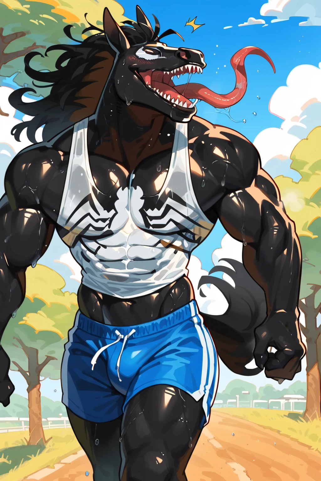Reinforcement Tags: anthro, anthro horse, no pupils, white eyes, black hair, black body, white markings, open mouth, tongue out, long tongue