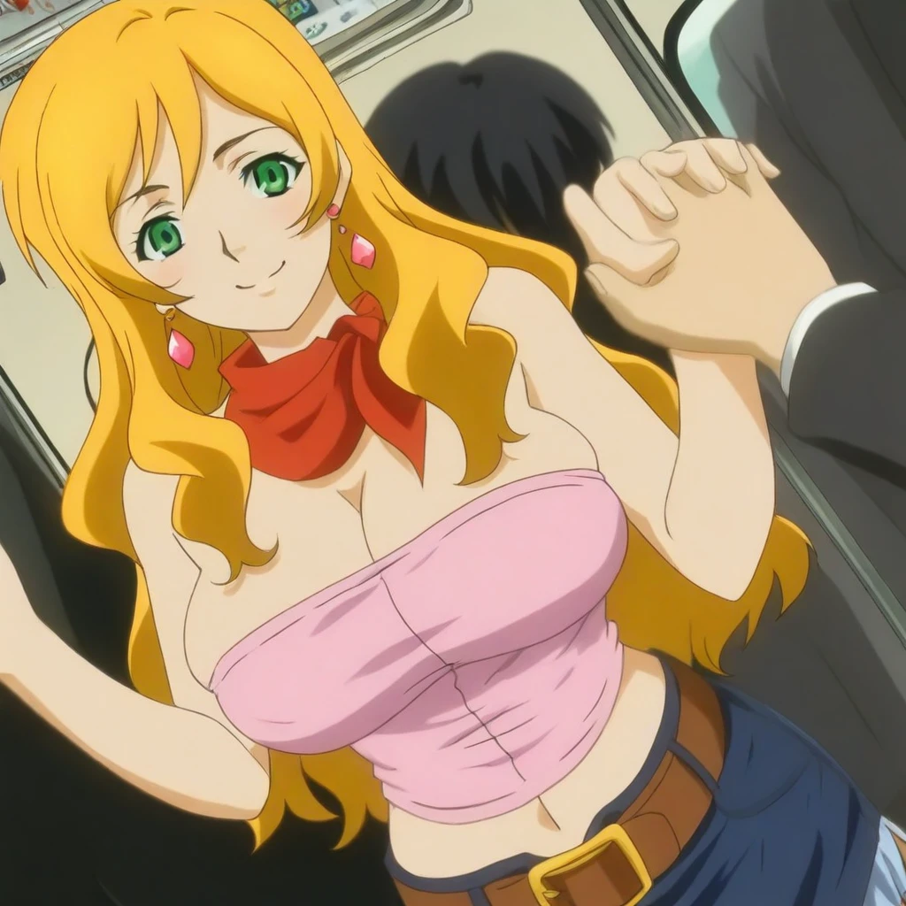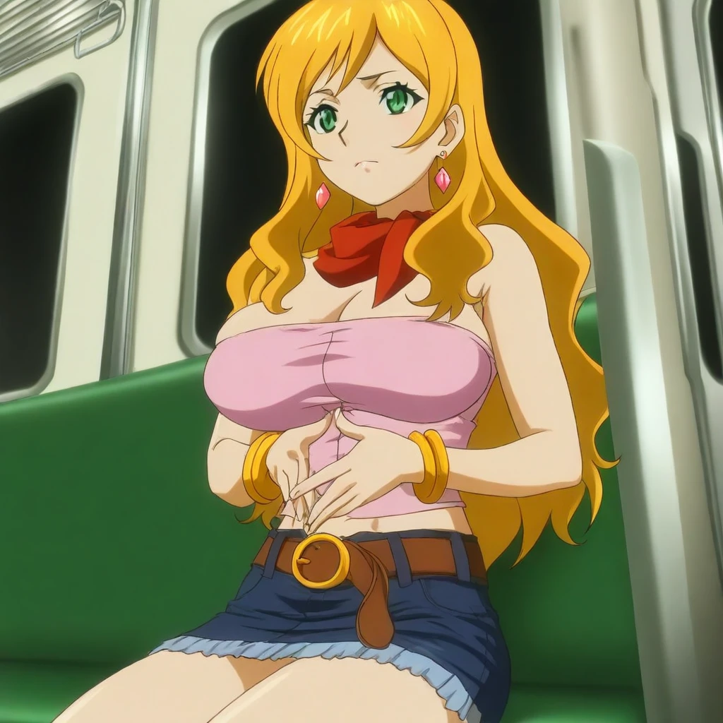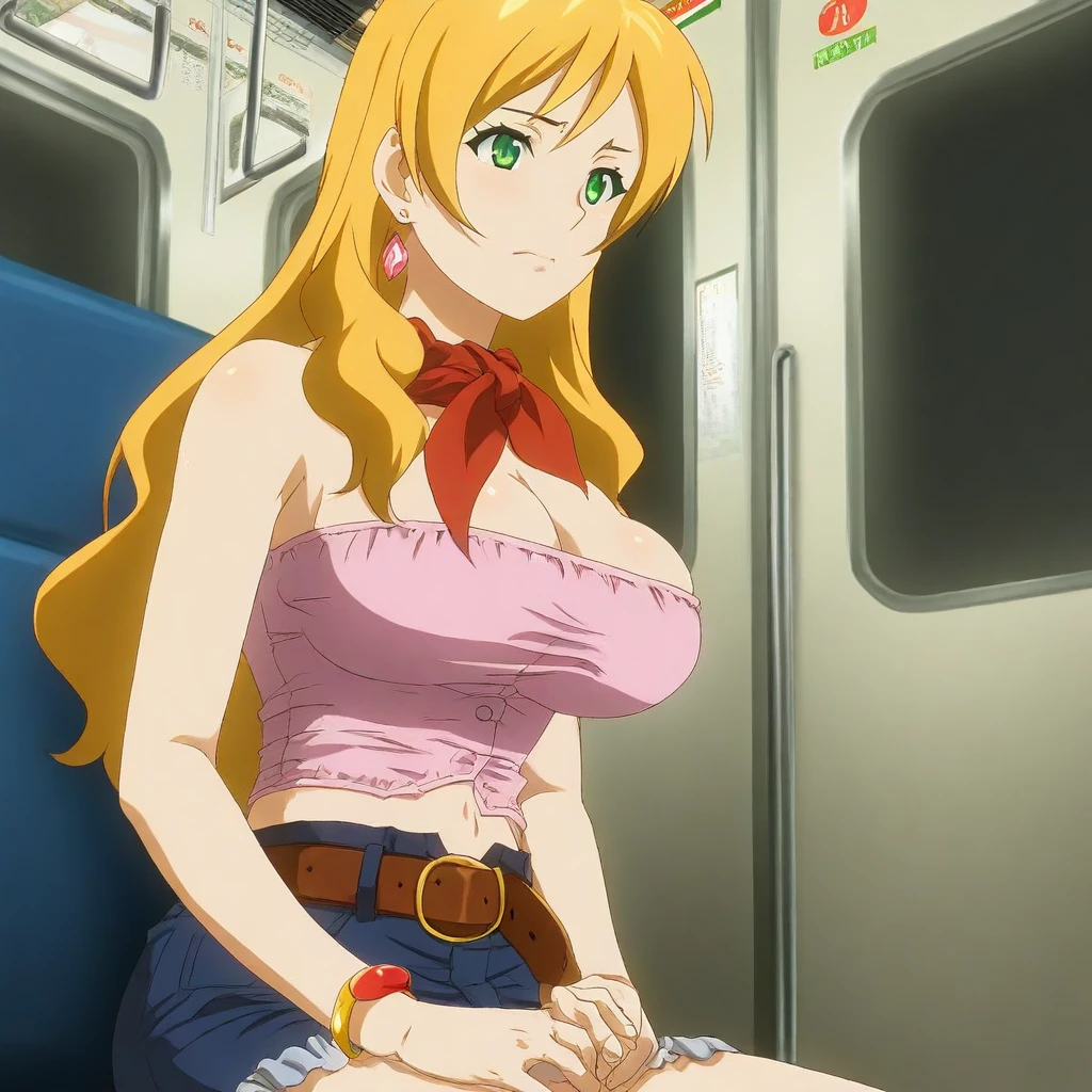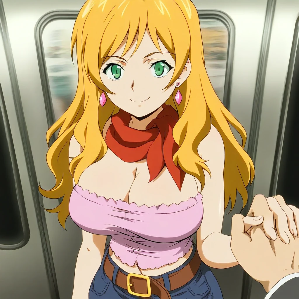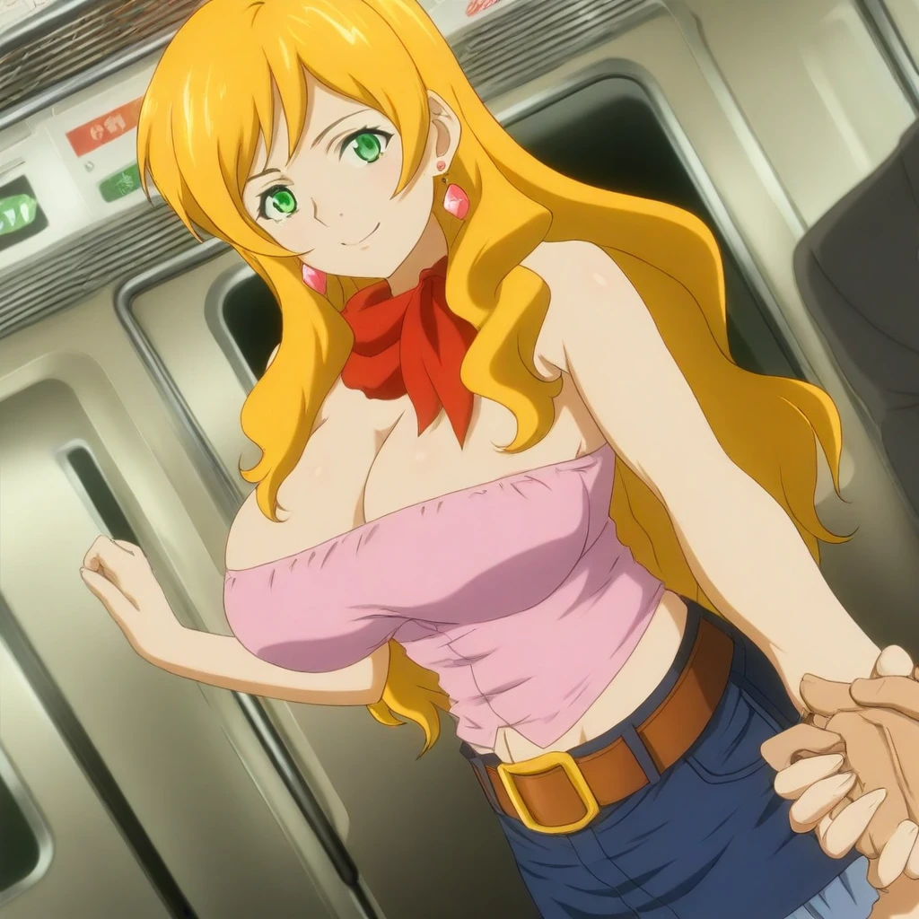 pink tube-top, cleavage, midriff, red neckerchief, blue denim skirt, belt, earrings, jewelry,