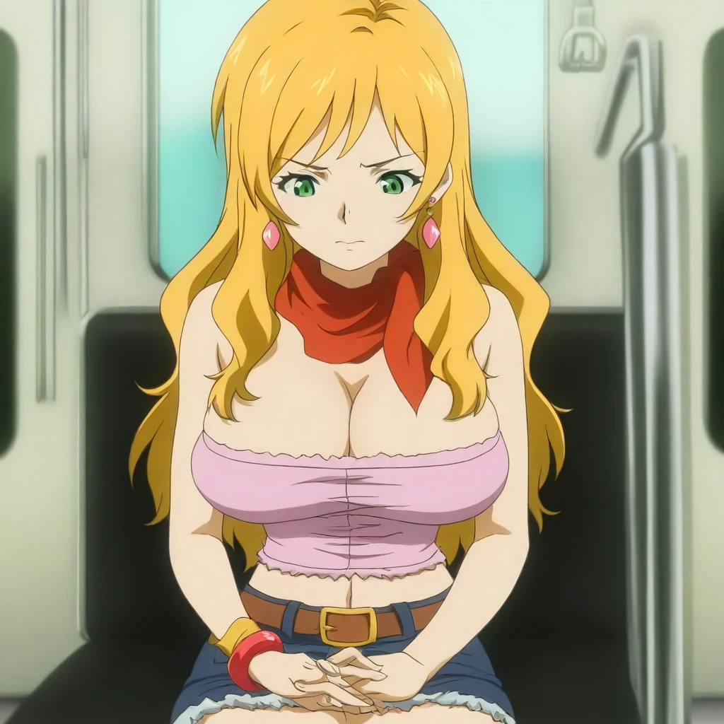 blonde hair, long hair, sidelocks, green eyes, big breasts,