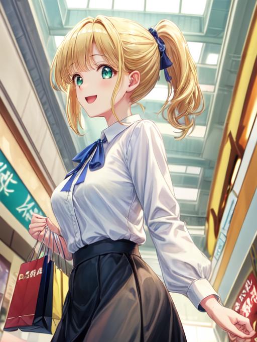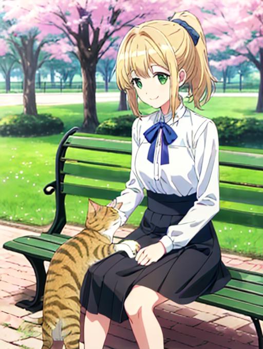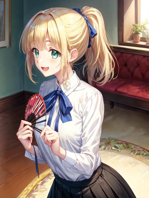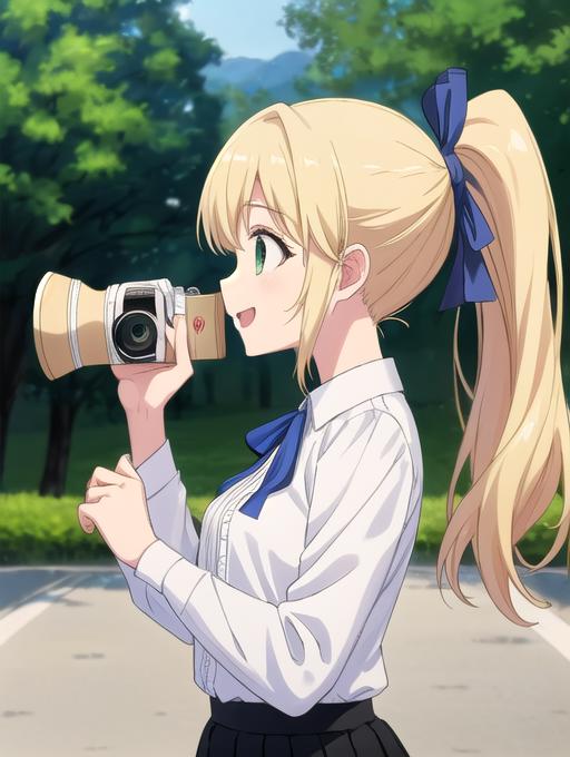 Additional words that may help: ponytail, blonde hair, white blouse, blue ribbon, green eyes,
