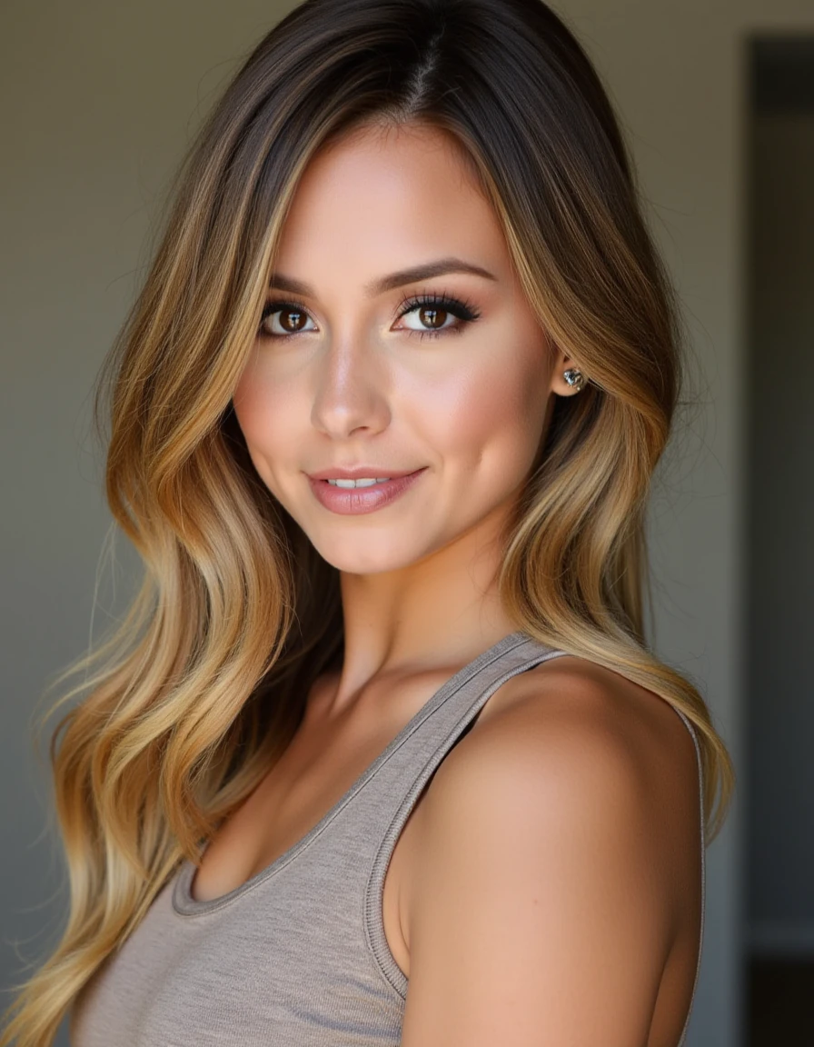 Prompt : katelyn andreassen, long hair brown hair, brown eyes, multicolored hair, blonde hair
