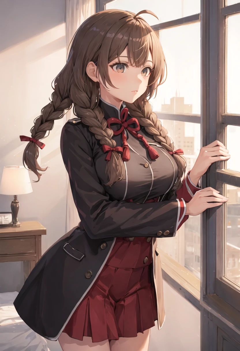 The trigger word is shinshuu_maru_kantaicollection, and the pruned tags are brown_hair, long_hair, braid, twin_braids, brown_eyes, breasts, large_breasts, ribbon, red_ribbon, hair_ribbon, ahoge.