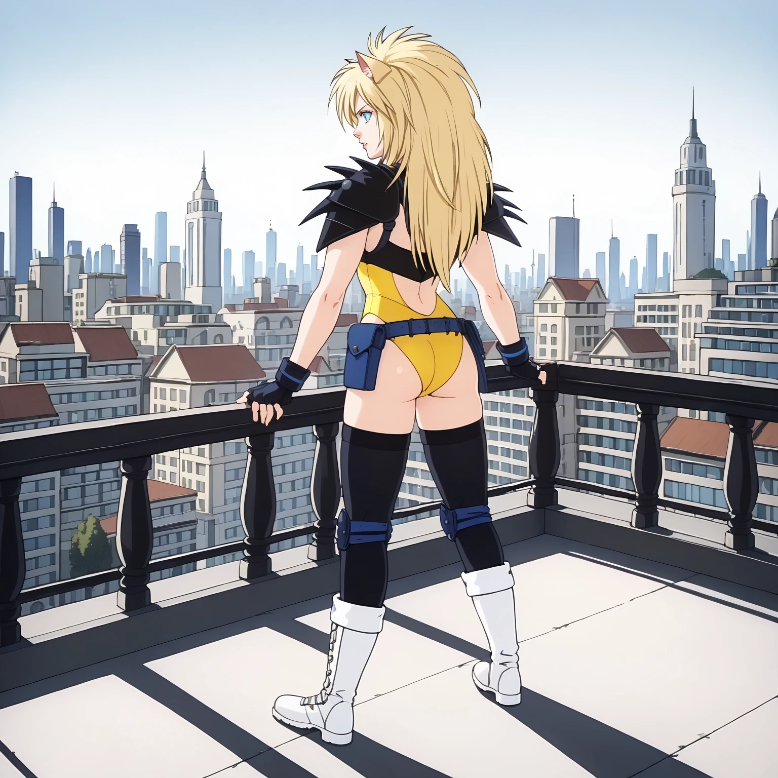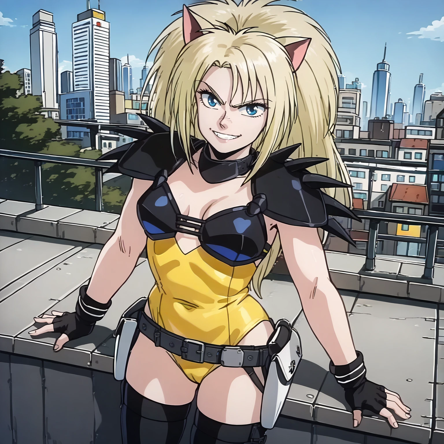 yellow leotard,black armor,cleavage,shoulder armor,black chest armor, fingerless gloves, belt,pouch, black thighhighs, knee pads, white boots,