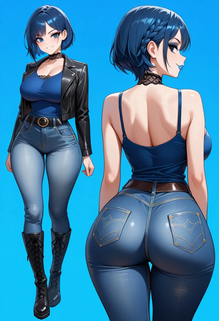 1girl, Ari-IL, short hair, braid, blue hair, blue eyes, bimbo lips, sexy body, large breasts, massive ass,