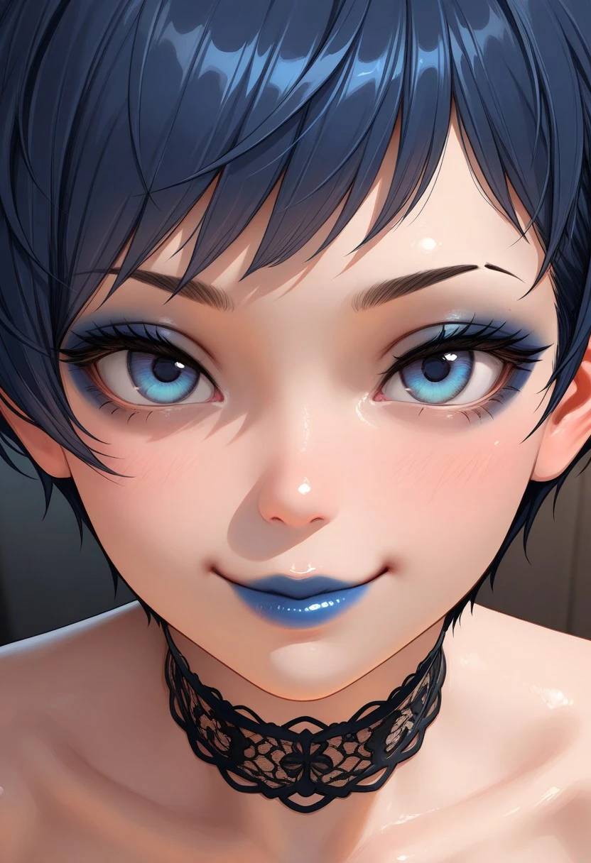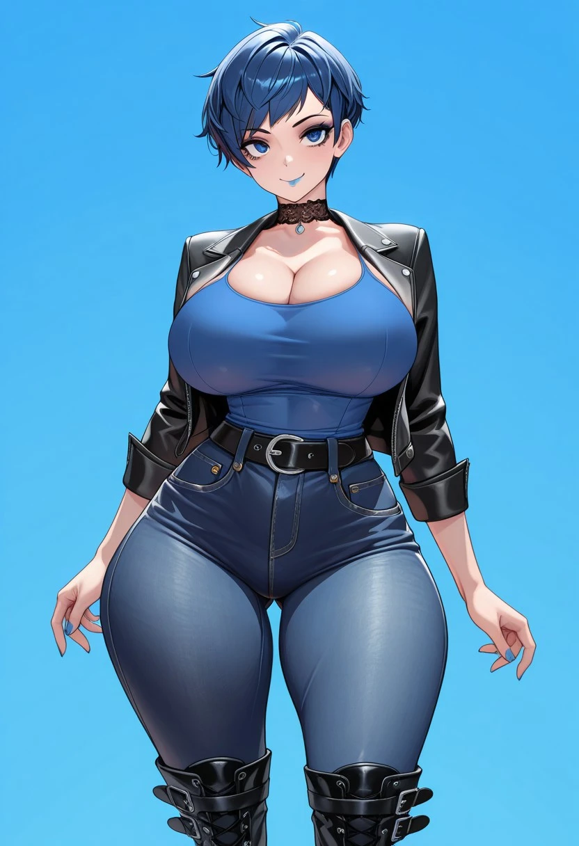 1girl, Zoe-IL, short hair, pixie cut hair, blue hair, blue eyes, bimbo duck lips, sexy body, massive breasts, large ass,