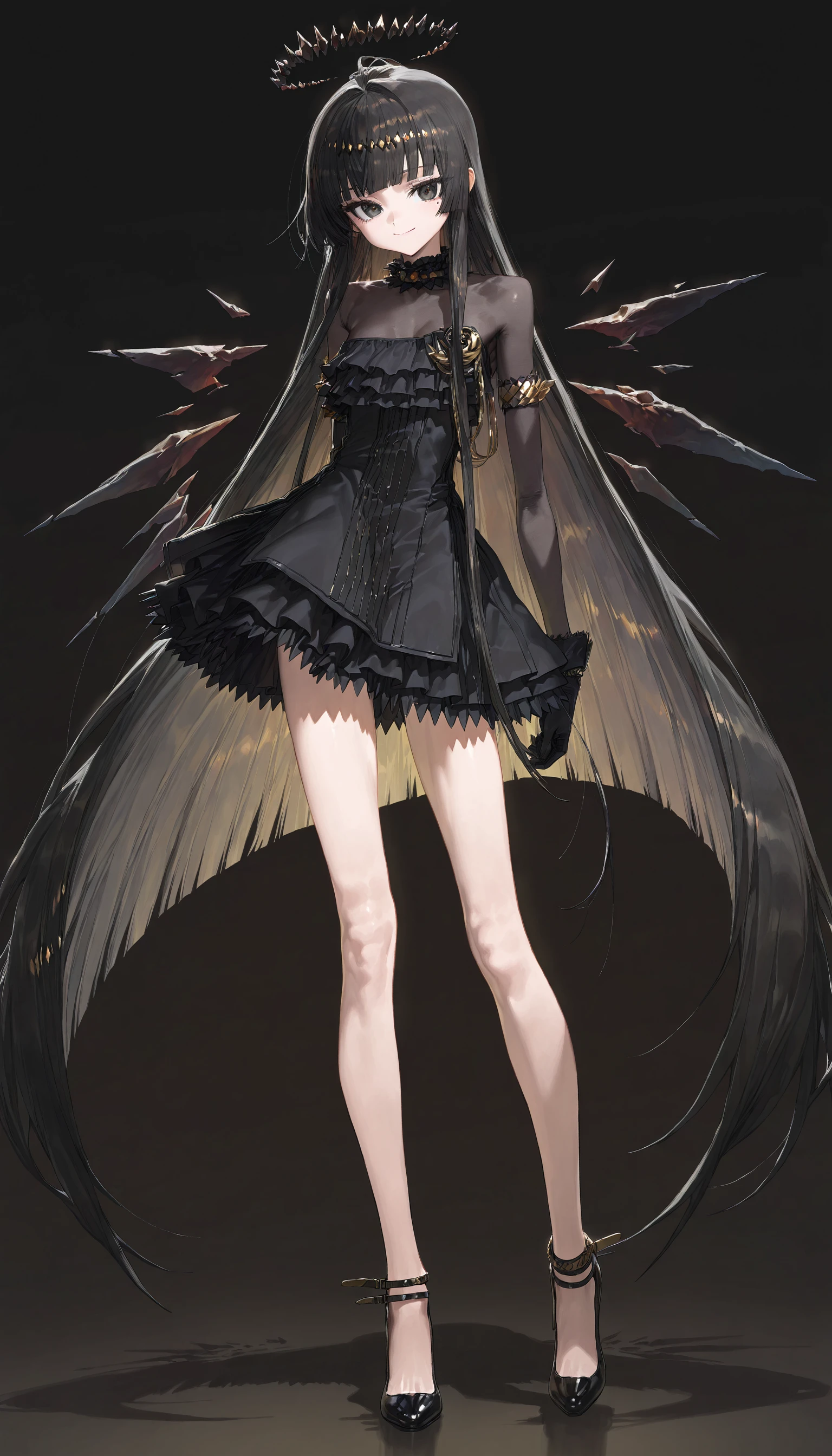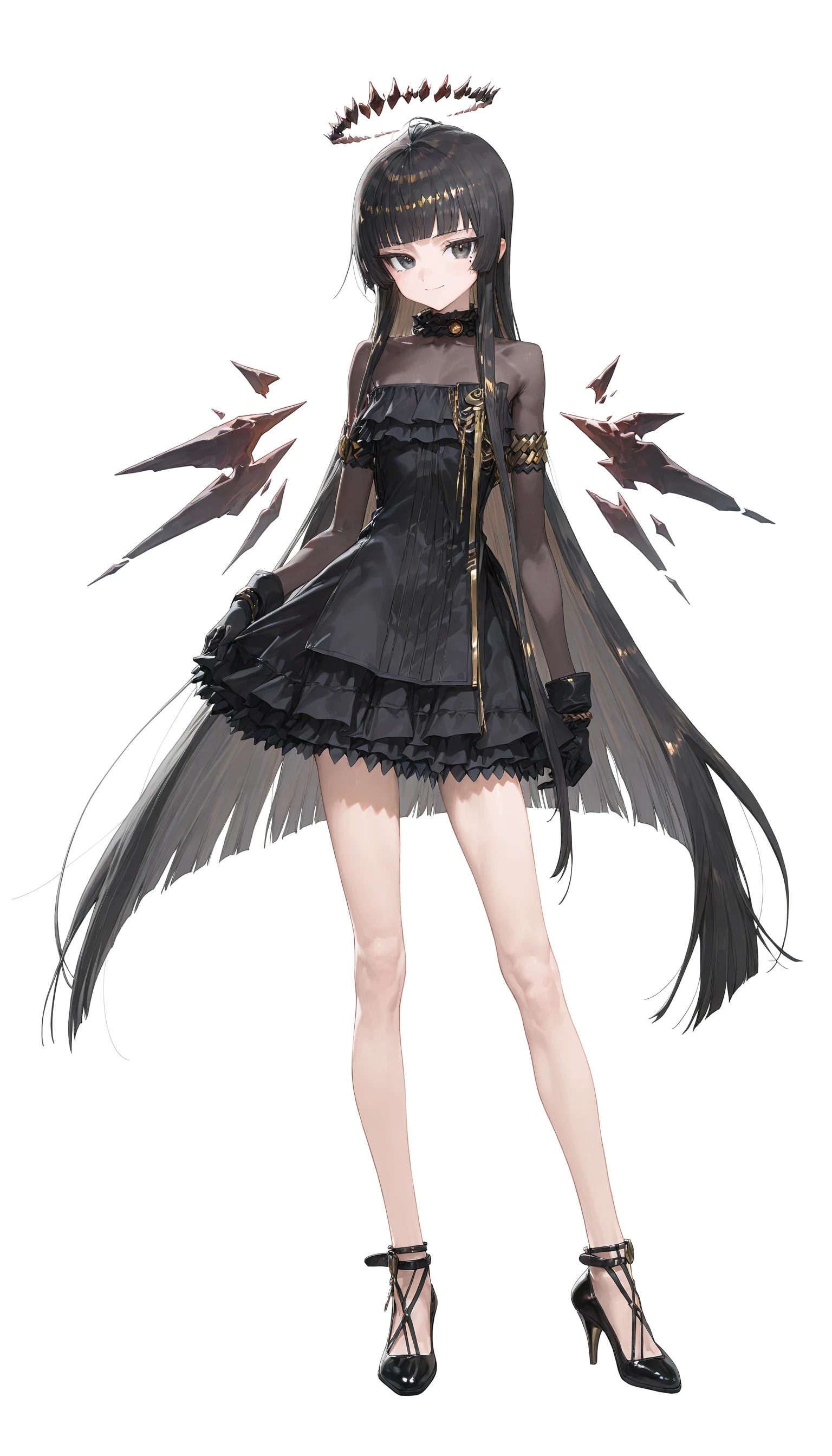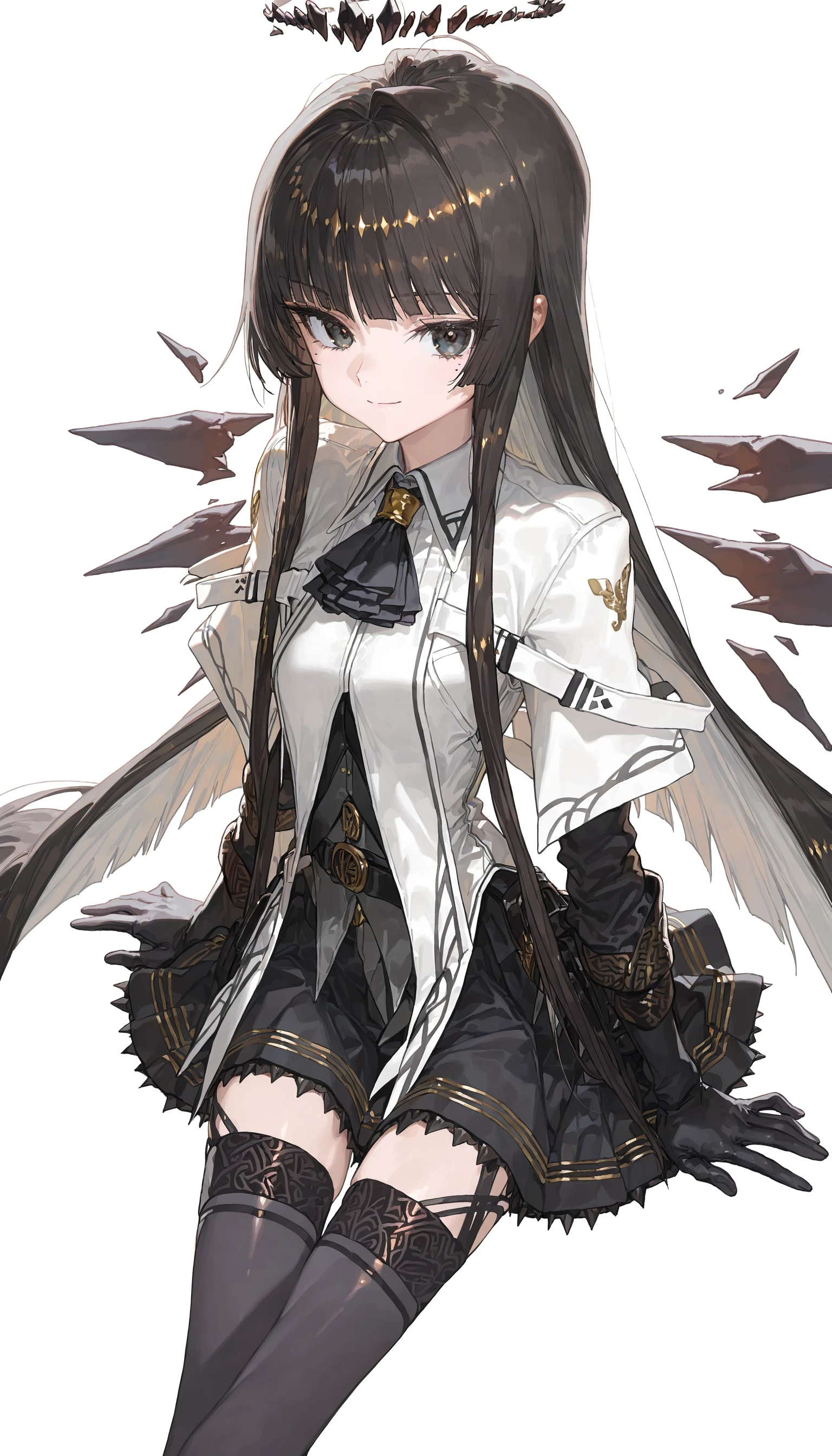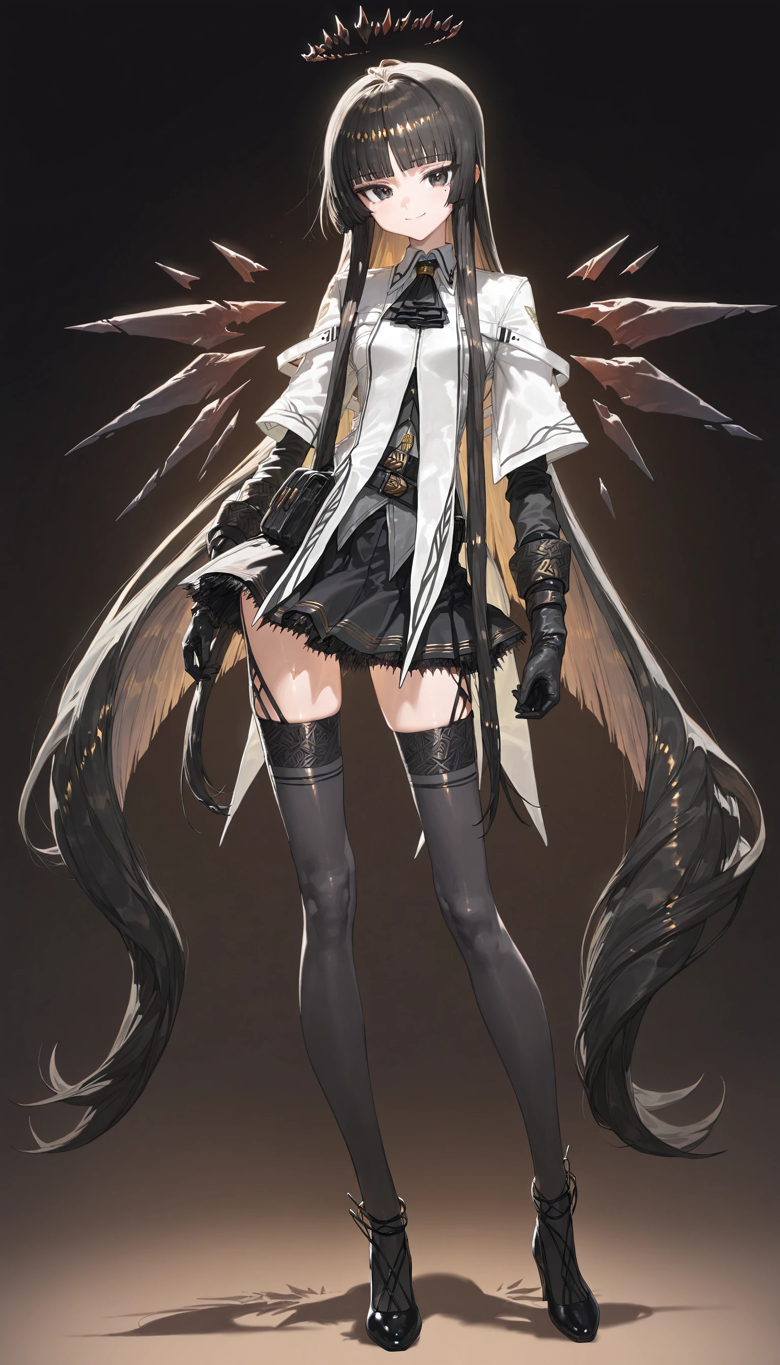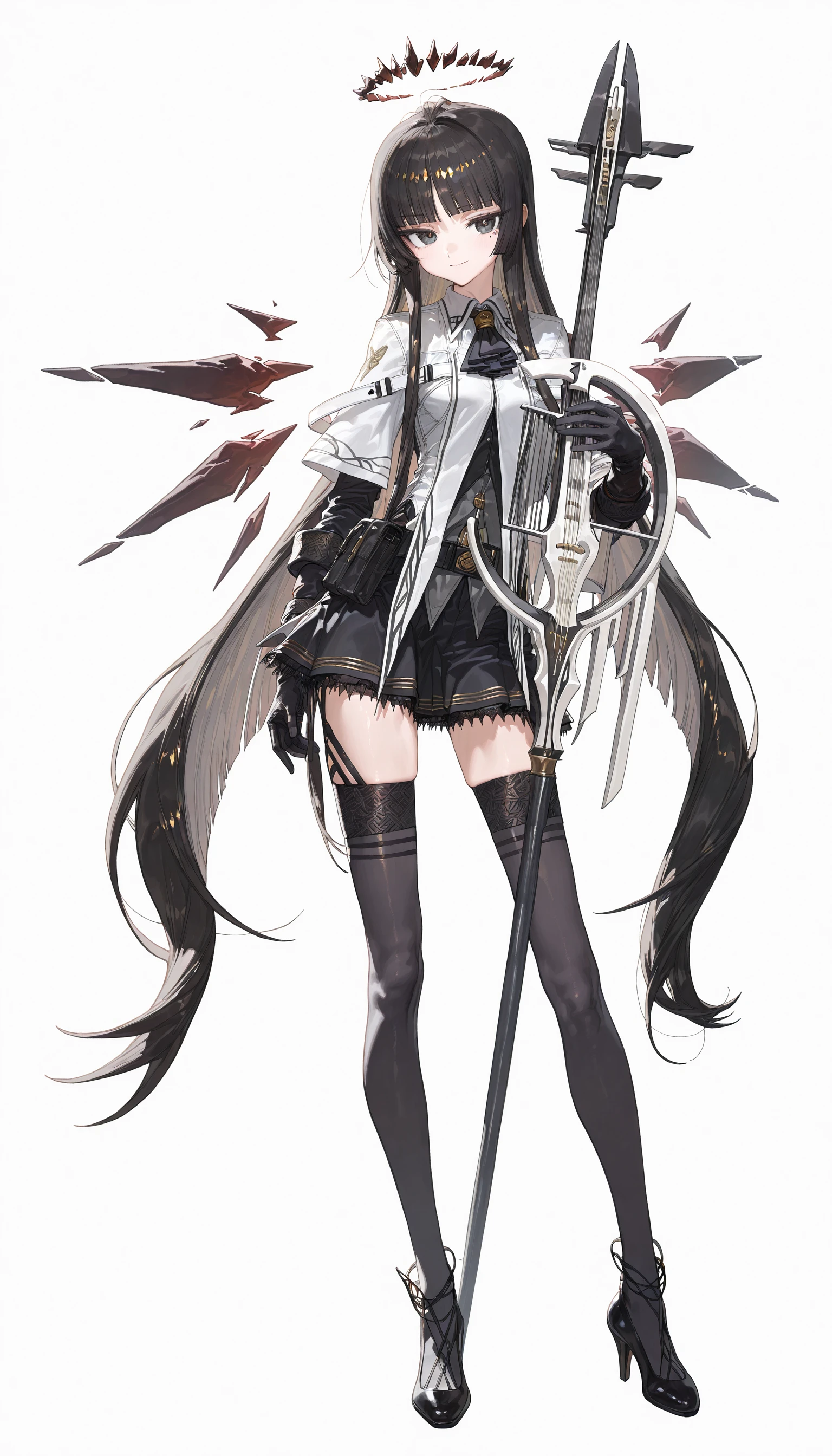 virtuosa_\(arknights\) , black eyes,black hair, blunt bangs,halo,mole under eye,two-tone hair ,colored inner hair, collared jacket, black ascot ,black garter straps ,black gloves,dress shirt ,black thighhighs,detached wings,miniskirt ,bustier,strappy heels,