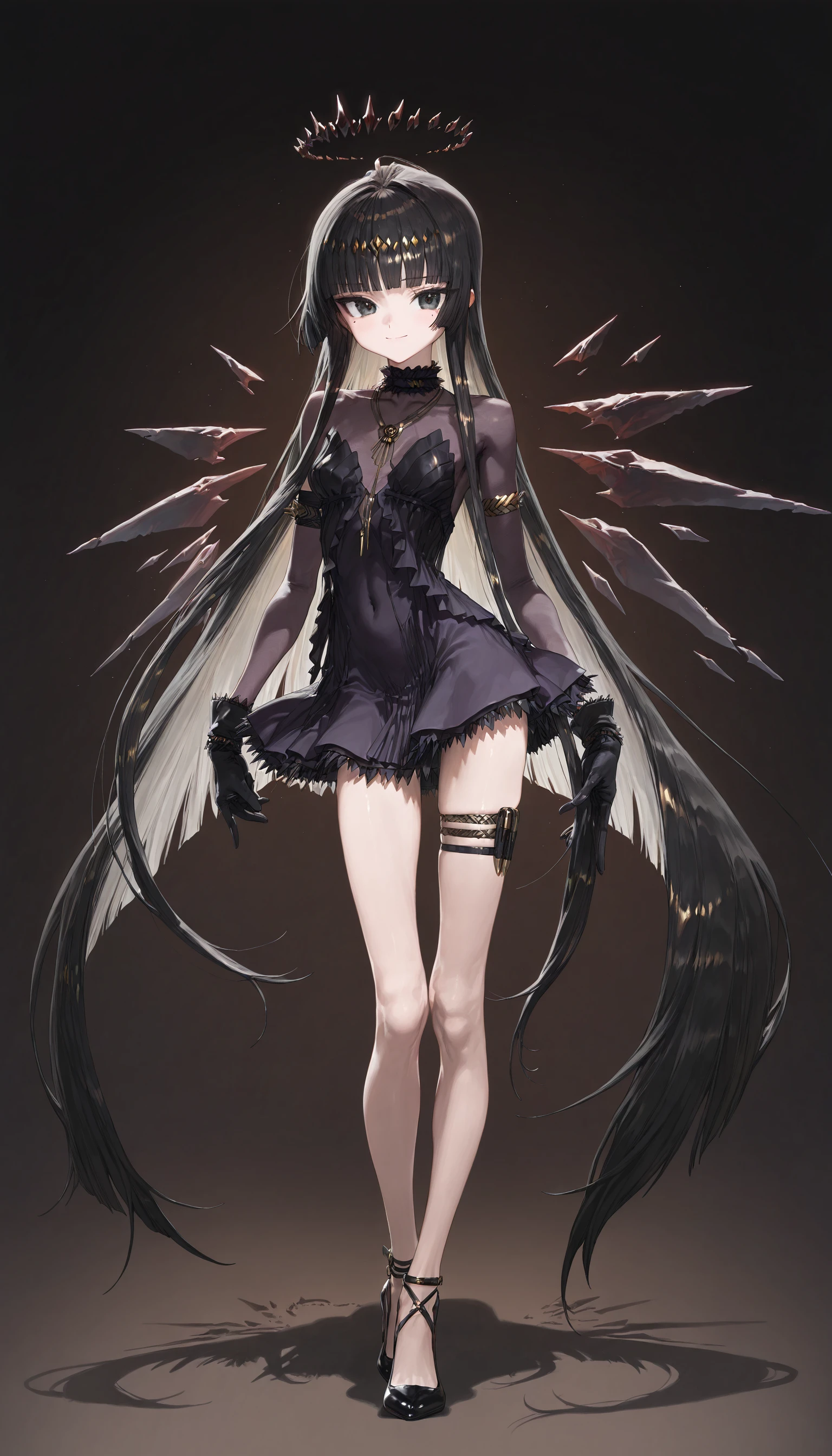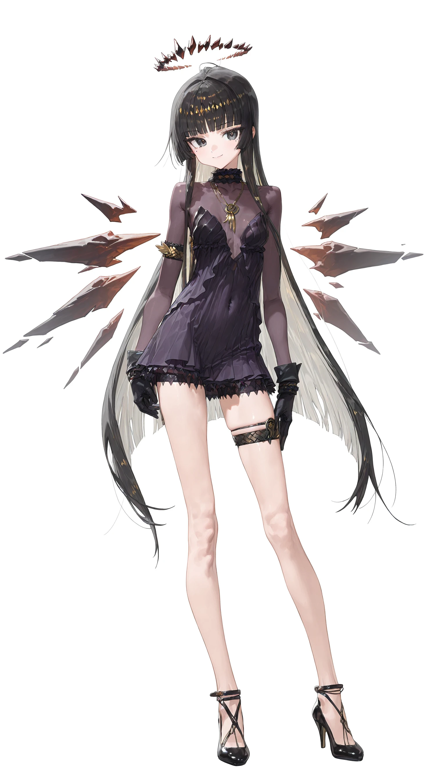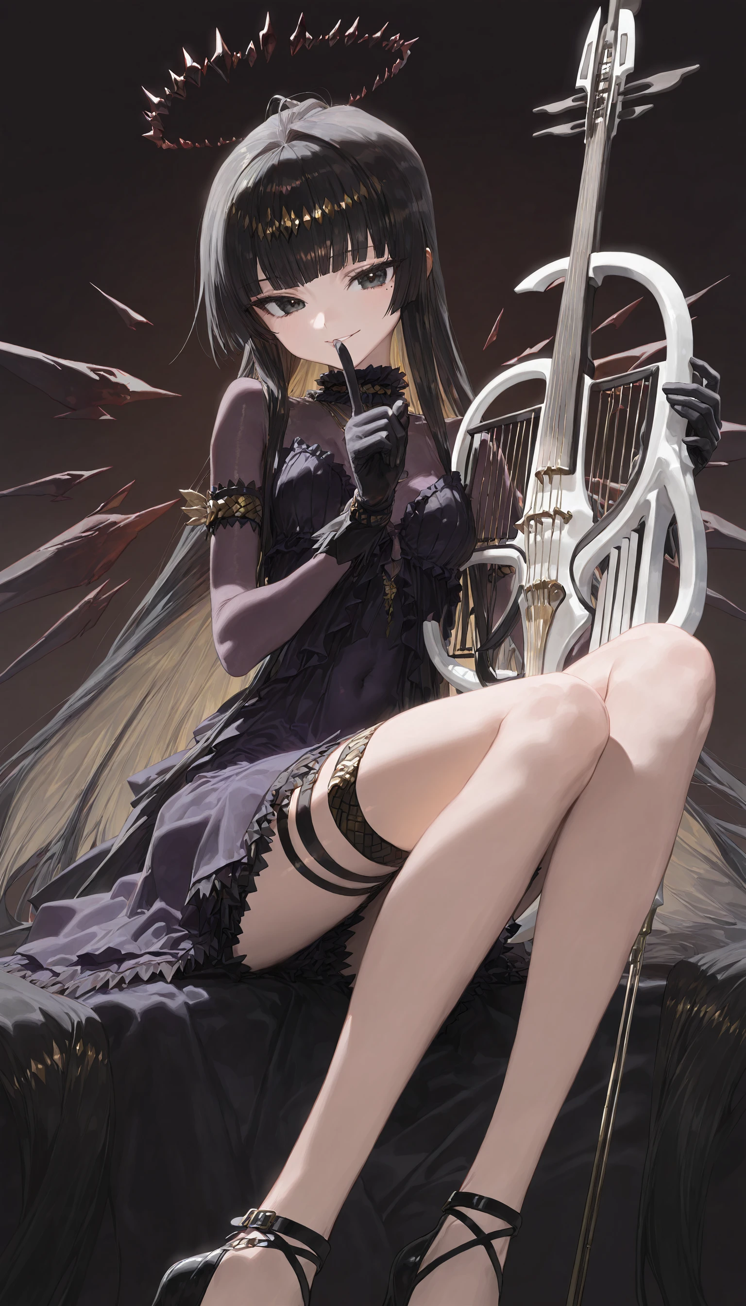 virtuosa_\(Diversity_Oneness\)_\(arknights\) , black eyes,black hair, blunt bangs,halo,mole under eye,two-tone hair ,colored inner hair, black gloves ,thigh strap,strappy heels,see-through bustier, short dress ,covered navel,purple dress,